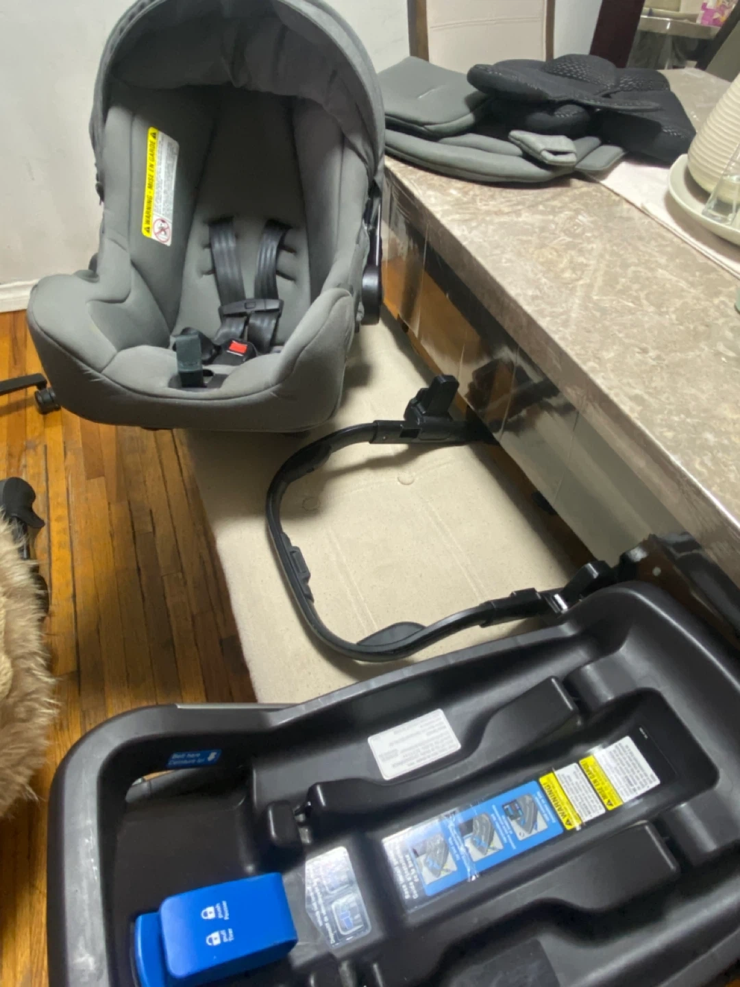 This is a Nuna PIPA infant car seat with its base. It's a grey colour. The car seat has a secure 5-point harness system. It's a great option for safely transporting your little one!