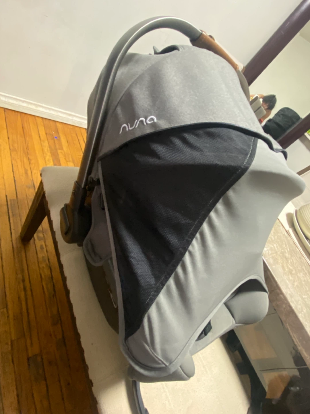 This is a Nuna PIPA infant car seat with its base. It's a grey colour. The car seat has a secure 5-point harness system. It's a great option for safely transporting your little one!