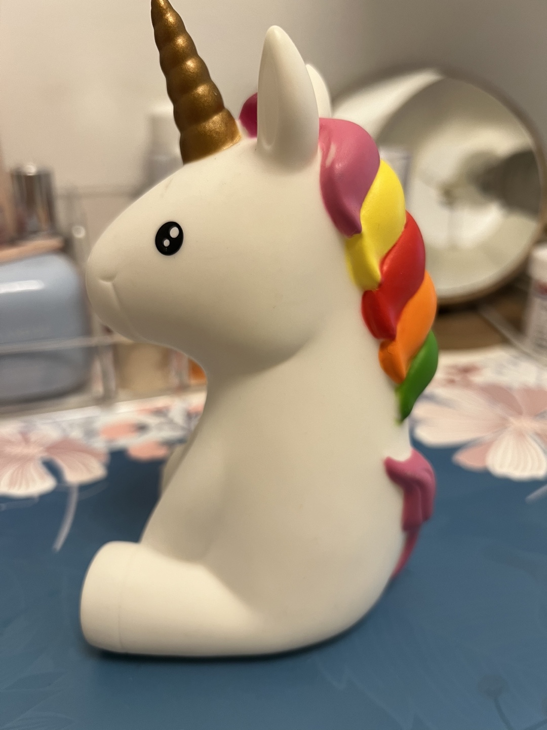 Cute sitting unicorn night light. Changes into multiple colors throughout the night. Battery-operated. Hardly used.