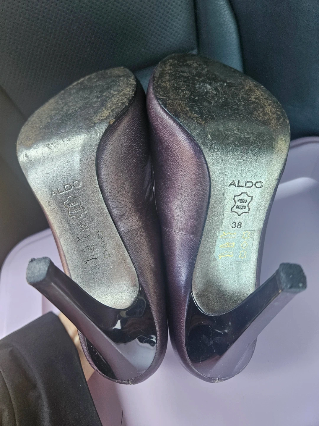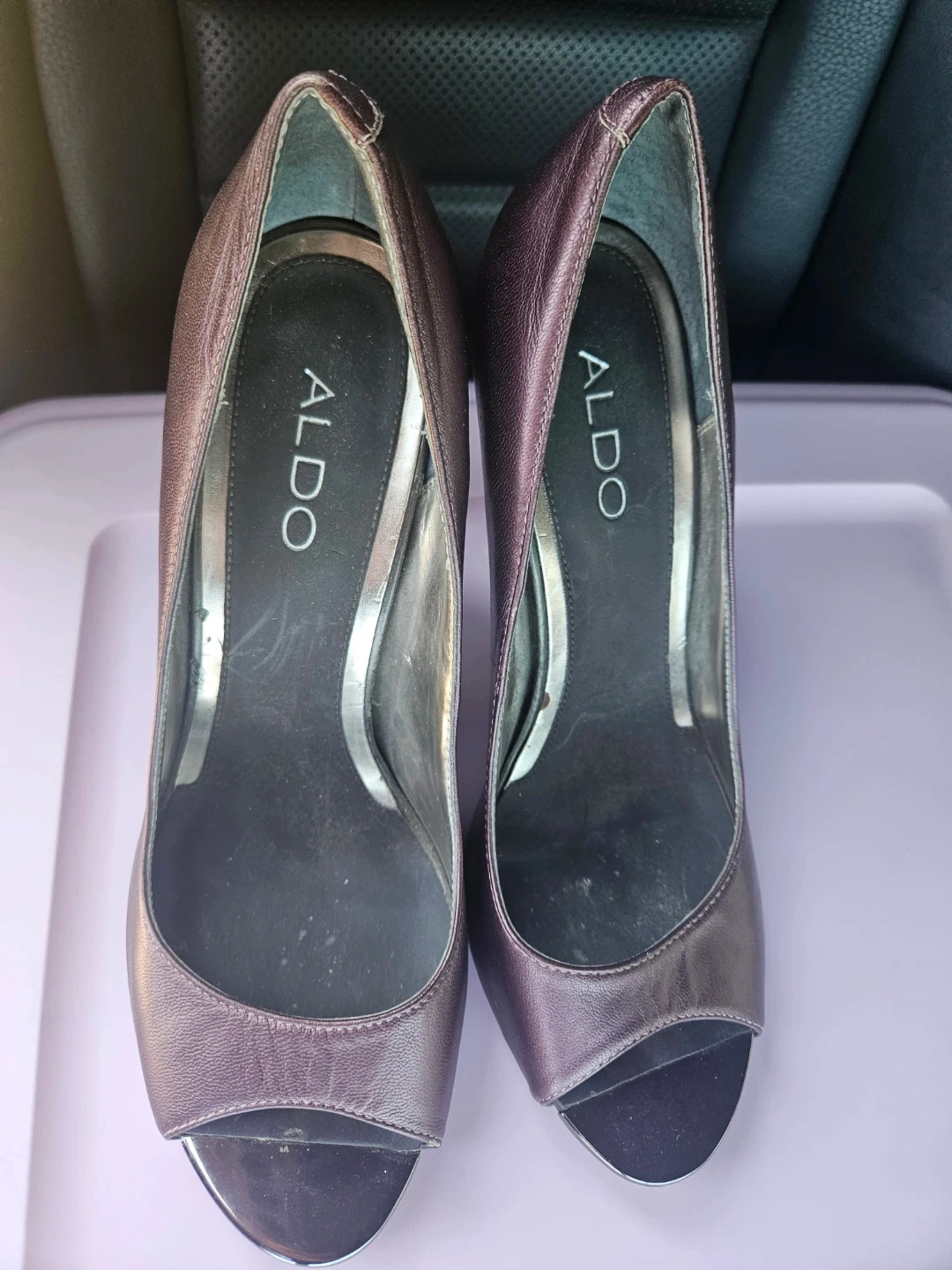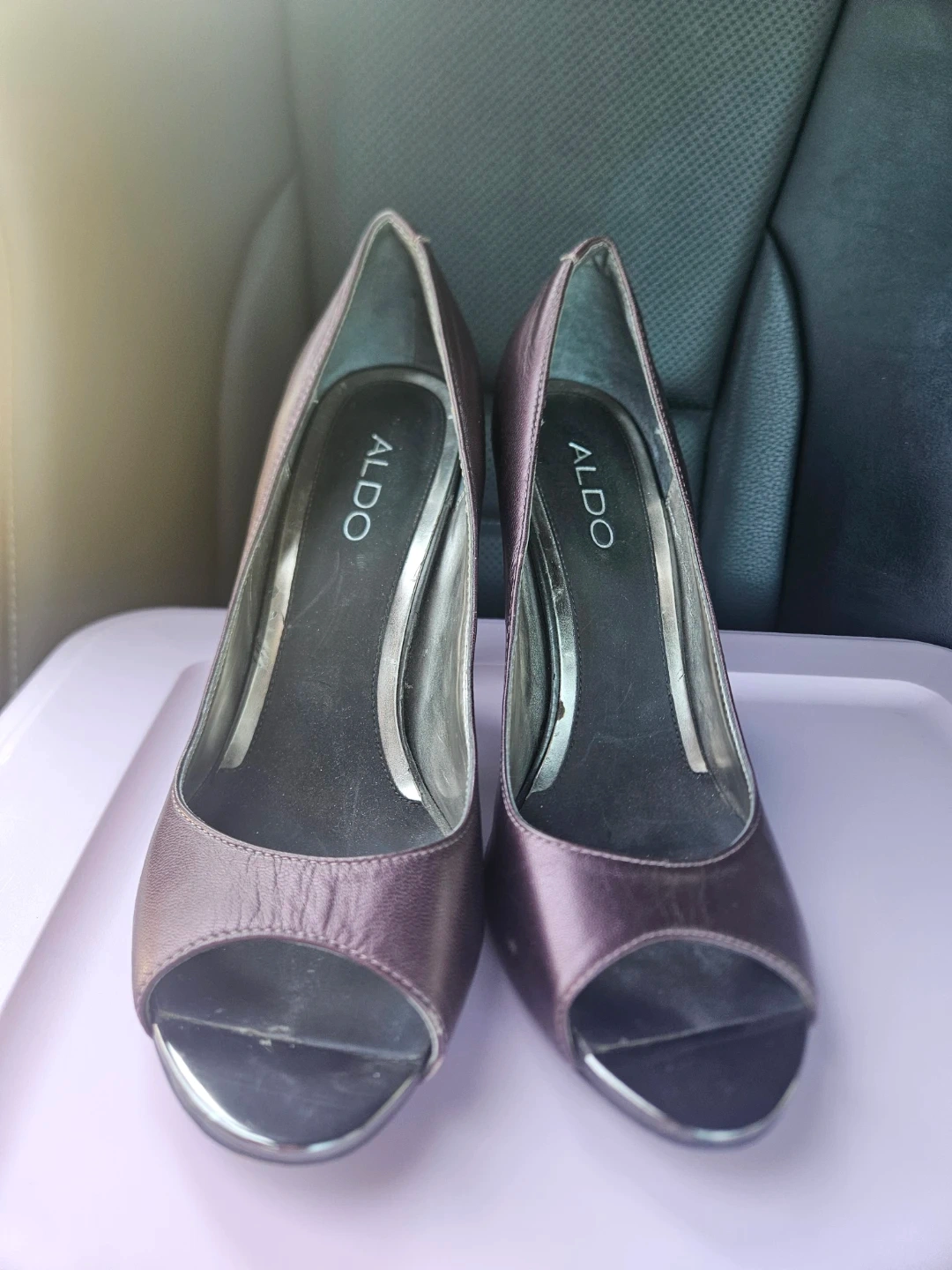 These ALDO peep-toe heels are a stylish metallic purple. Size 38. They feature a classic pump design with a peep-toe front. Perfect for dressing up any outfit!