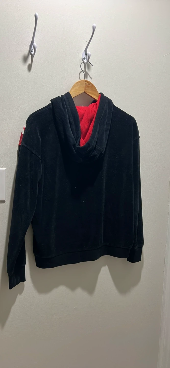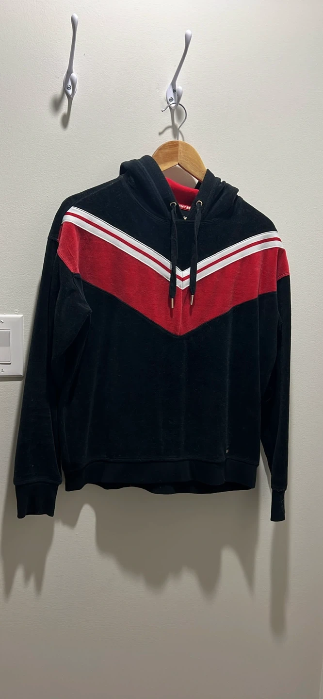 This is a black velour hoodie by Tommy Hilfiger. It features a red and white chevron stripe detail across the chest and a red interior lining. It's a cozy and stylish addition to any wardrobe!