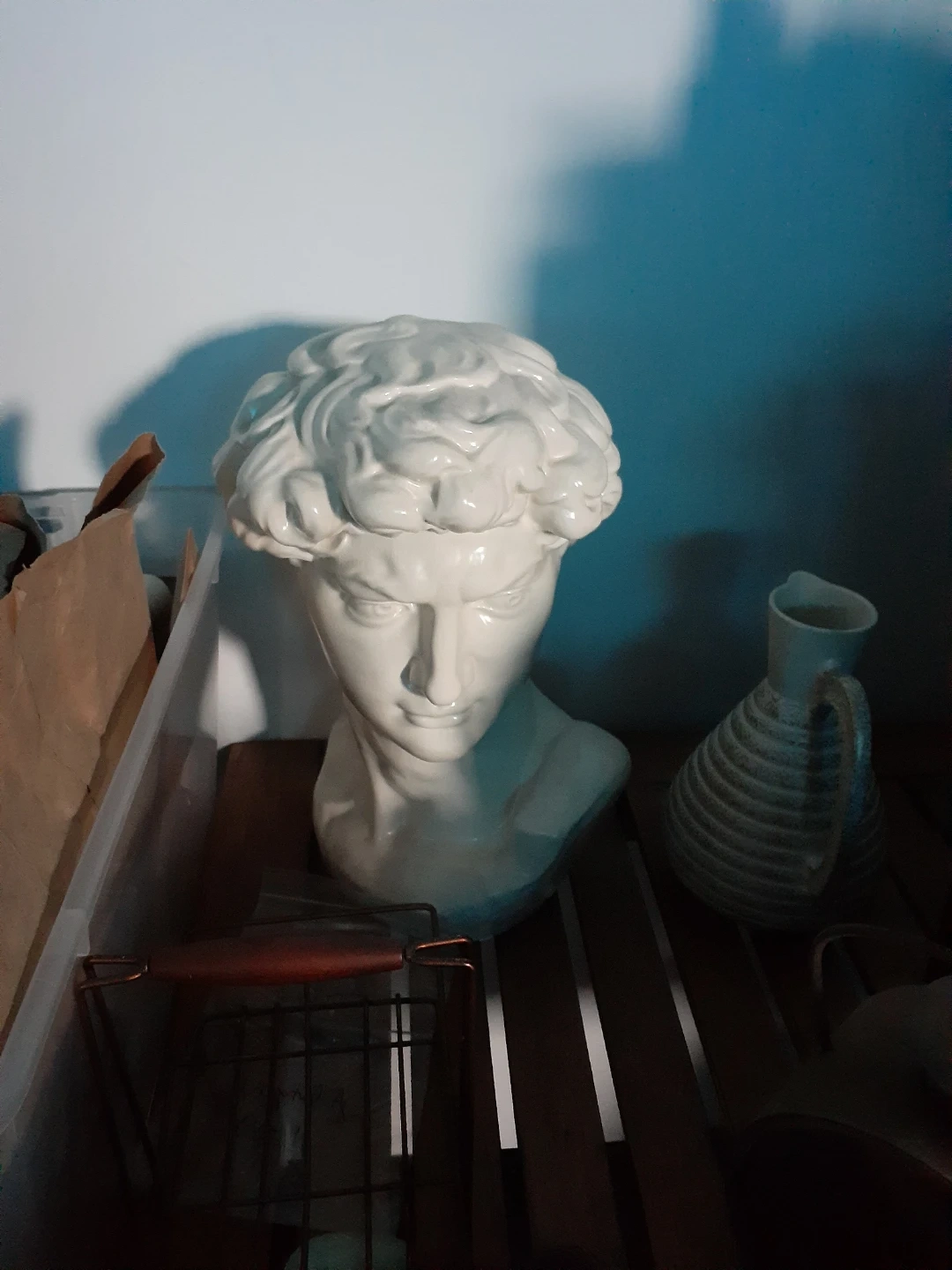 A decorative white ceramic bust of David. This piece has intricate detailing on the hair and facial features. It's a classic statement piece for any home.16 ".no flaws.