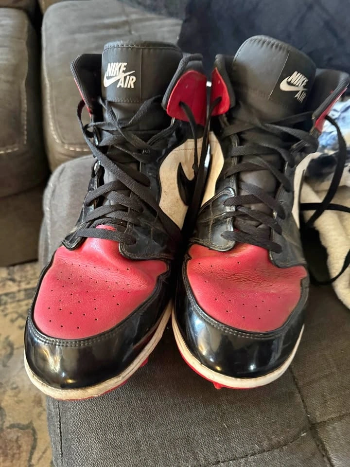 Size 17 Nike Air Jordan 1 cleats with black patent leather and red leather panels. These are used but in good condition. Just need to be cleaned.