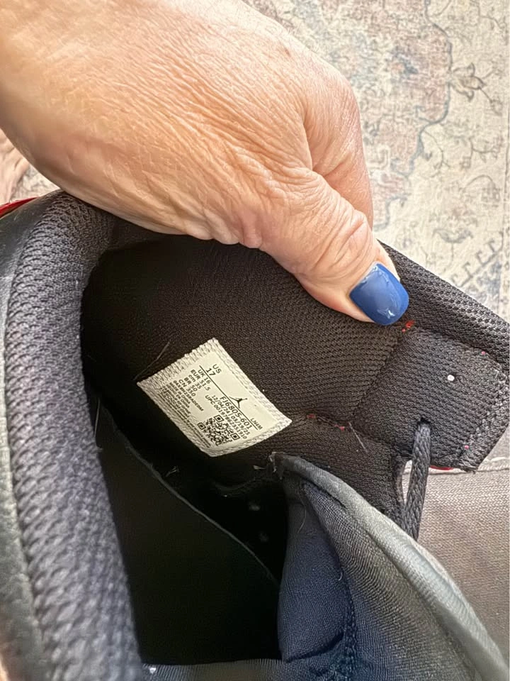 Size 17 Nike Air Jordan 1 cleats with black patent leather and red leather panels. These are used but in good condition. Just need to be cleaned.