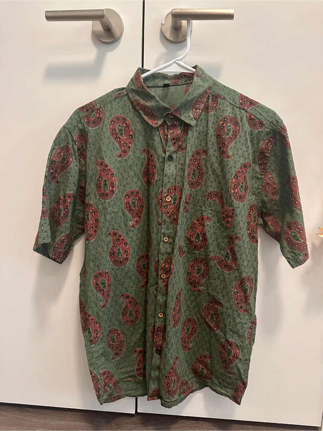 A unisex printed button-down shirt! It's a short-sleeved shirt with a unique pattern. Perfect for adding a pop of colour to your wardrobe. In great condition and ready for a new home. 100% cotton.
