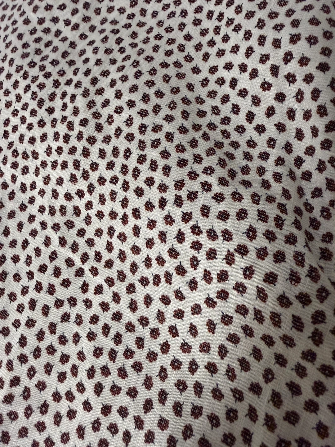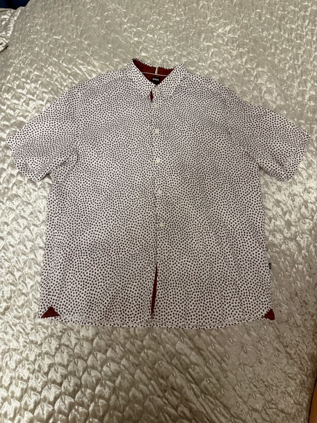 Men’s BOSS short-sleeve shirt in excellent condition. Regular fit. Lightweight linen blend, breathable and comfortable — perfect for summer. White base with small burgundy pattern and contrast inner collar detail. Original BOSS quality. No stains or damage.
