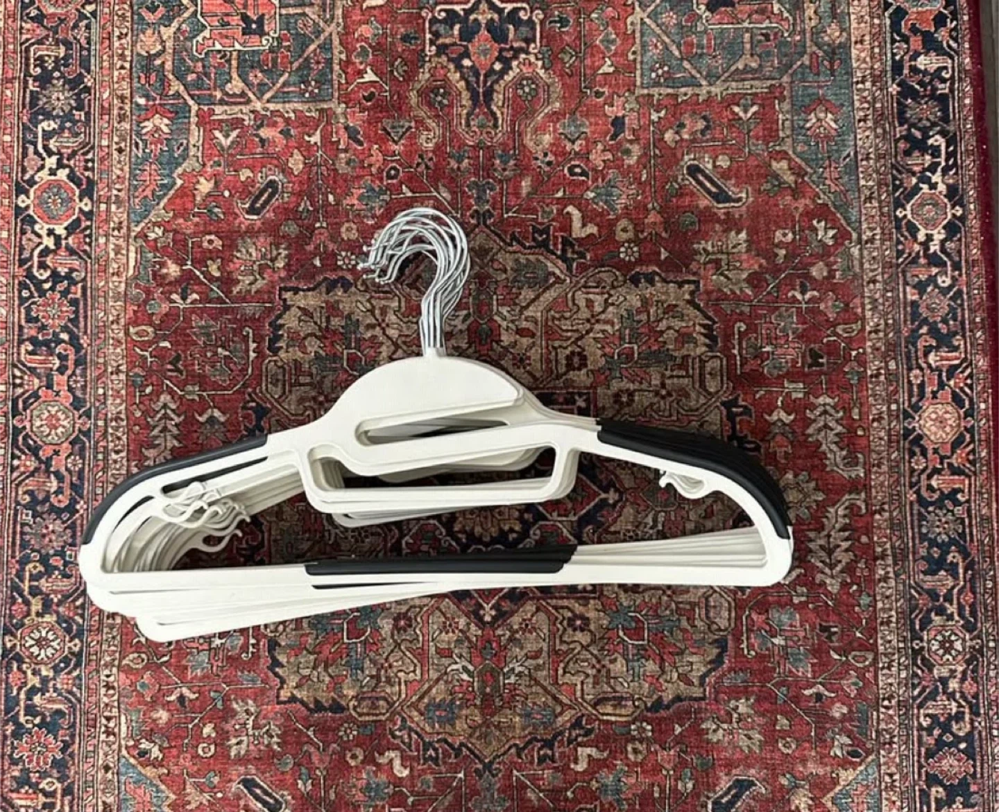 This is a set of 15 white non slip clothes hangers. They feature a slim design with non-slip shoulders to keep clothes from falling off. Metal hooks for durability.