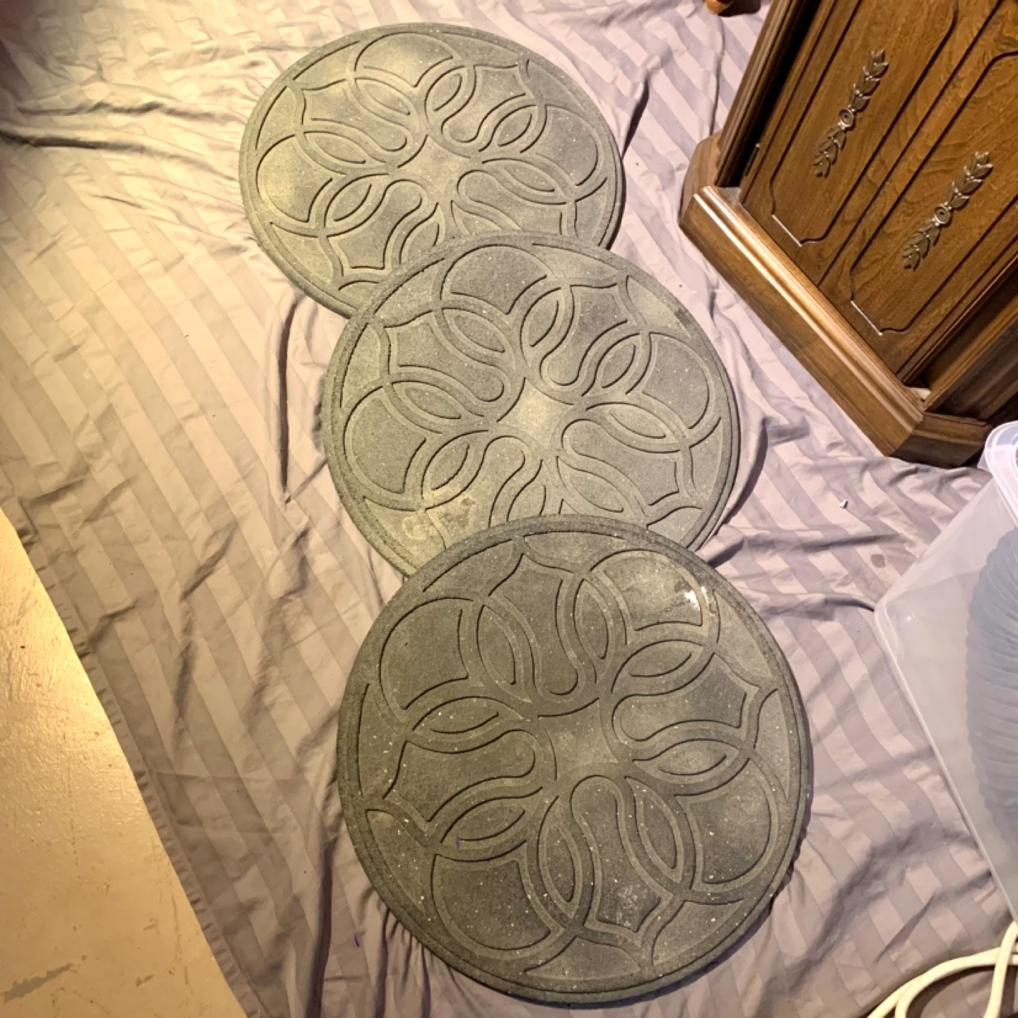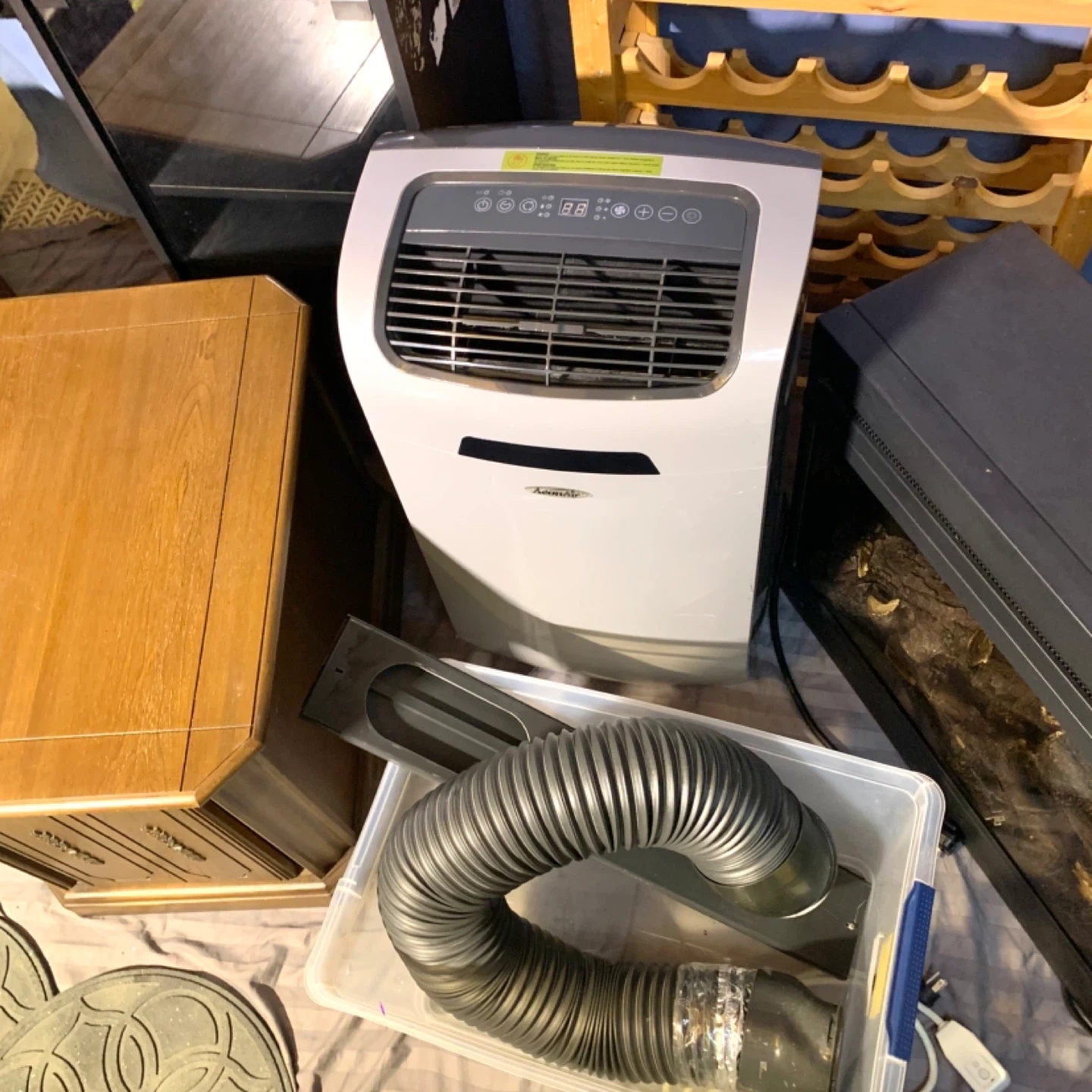 Furniture and appliances bundle including wood side tables, end tables, console cabinet, wood wine rack, electric fireplace, portable air conditioning unit, window air conditioner, outdoor plastic circular foot mats for garden or yard, and more. Great mix of indoor and outdoor essentials perfect for home setup, storage, and comfort.