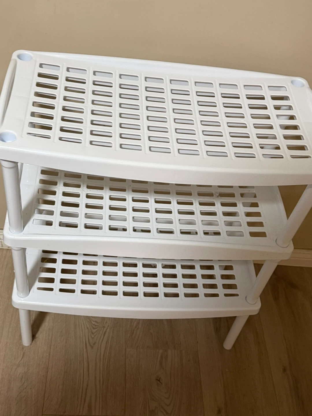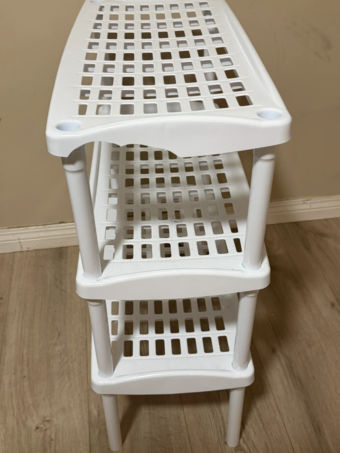 This is a white 3-tier plastic shelf unit. It's made of durable plastic and has a slatted design on each shelf. It's great for organizing shoes, toiletries, or other household items.