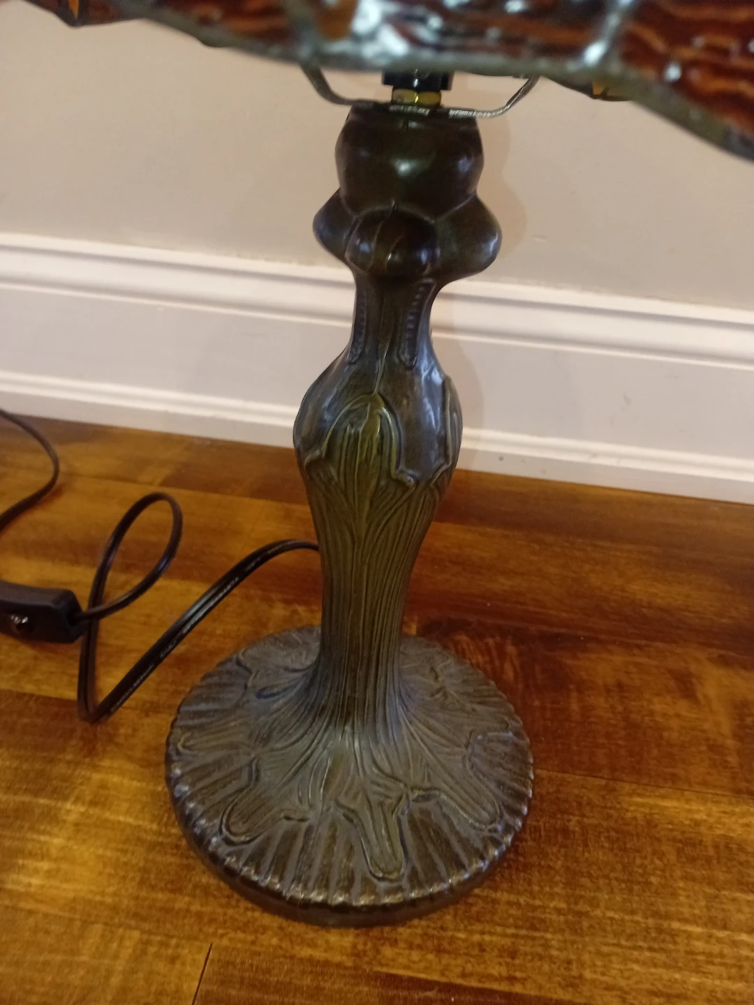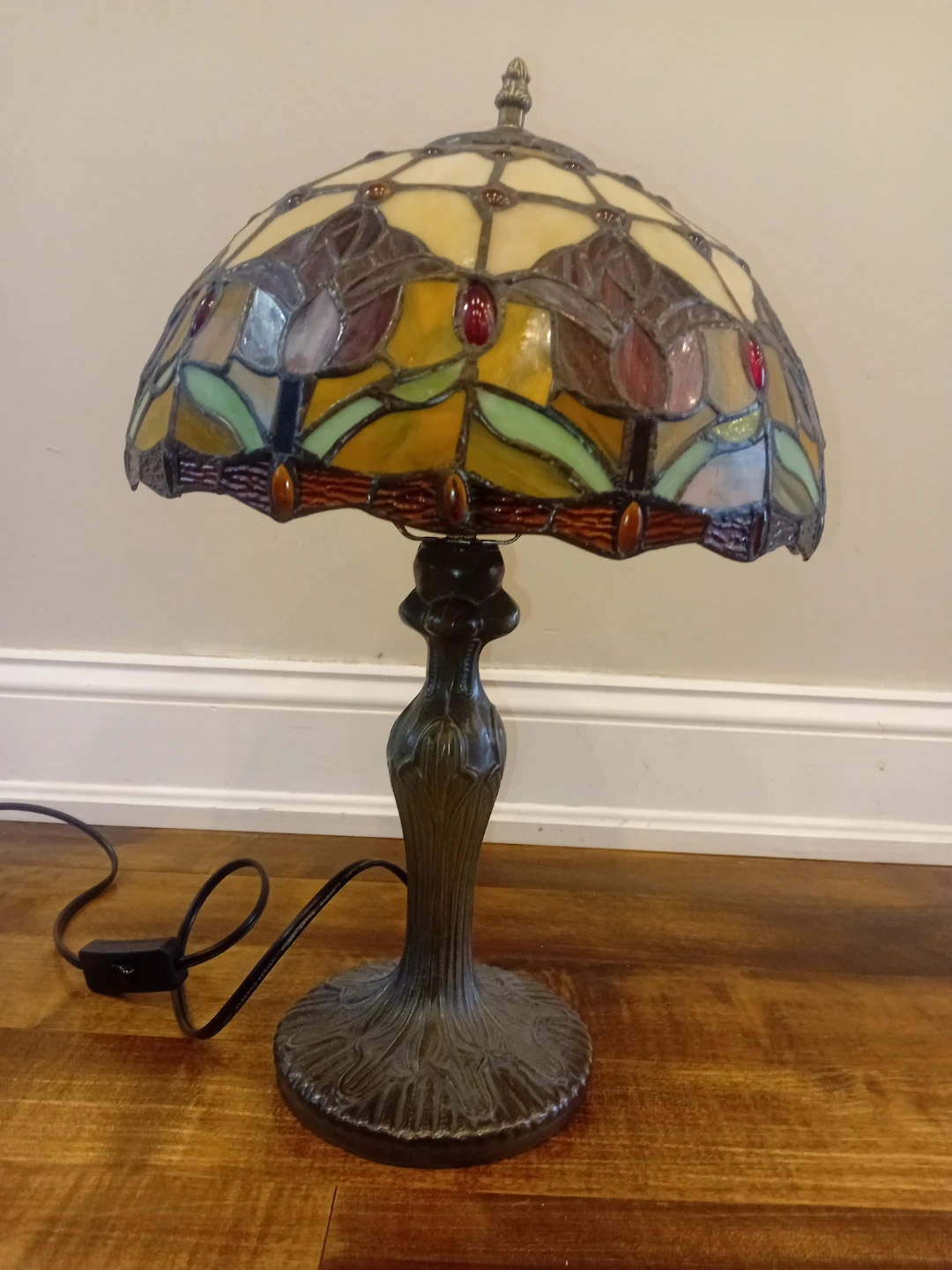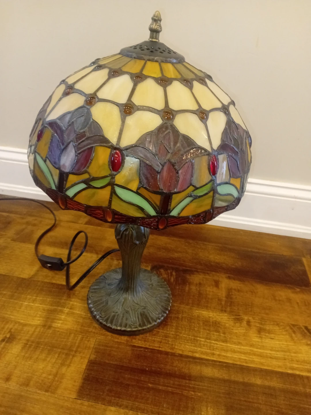 A beautiful stained glass table lamp with a colourful floral design. It has a sturdy metal base and a decorative shade.