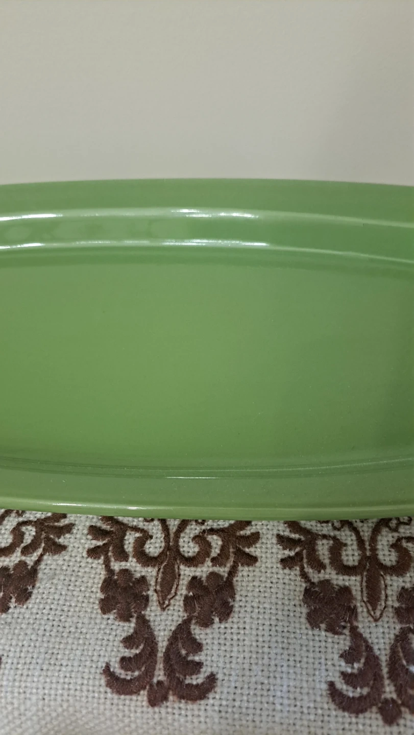 This oval platter is a lovely lime green colour. It's made of ceramic and perfect for serving appetizers or sides. Great for your next gathering!