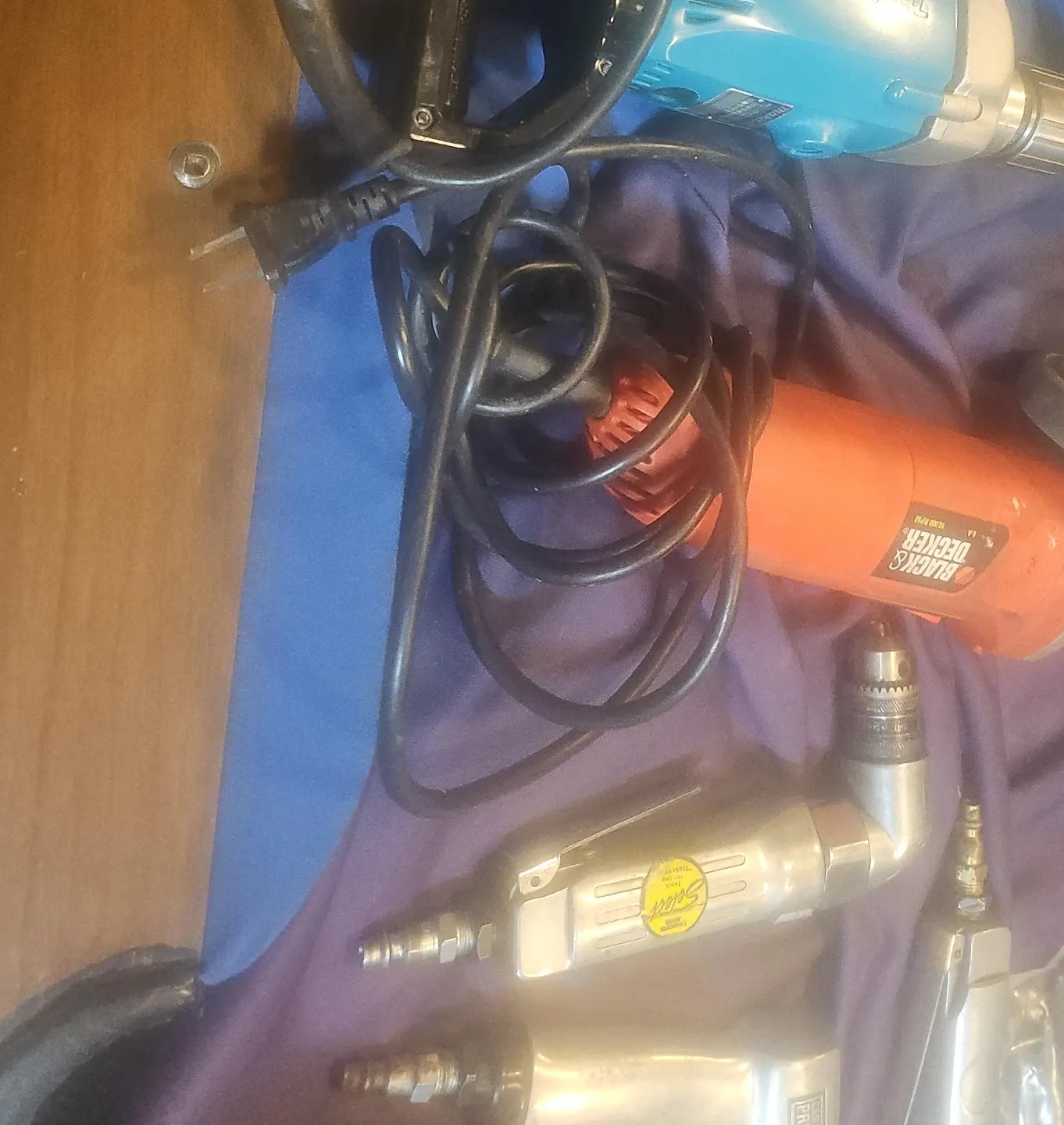 Orange Black & Decker angle grinder and a silver rotary tool are included. Both tools have cords. The angle grinder has a chuck, and the rotary tool has a yellow sticker that says "Select Tools."