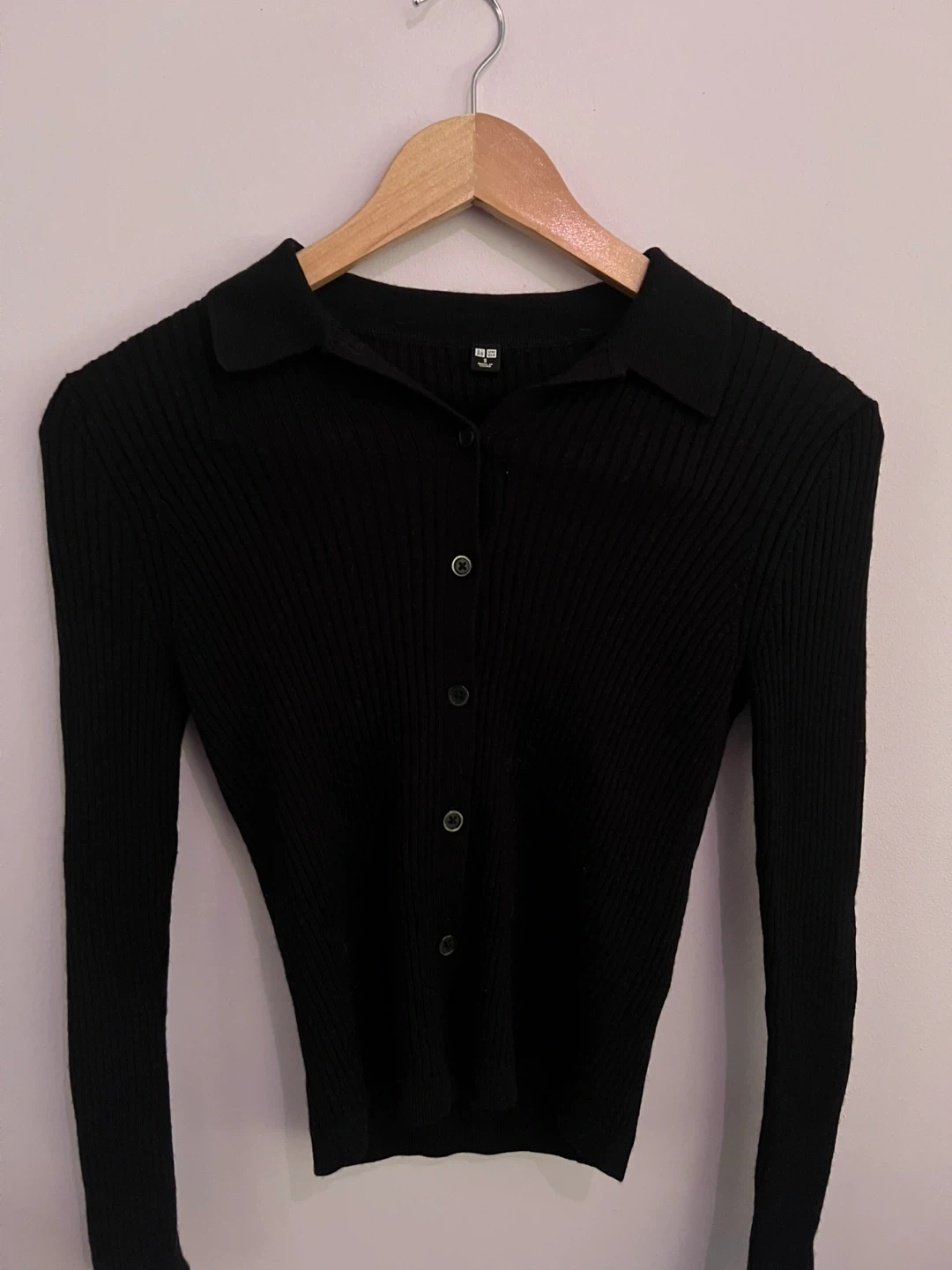 This is a black ribbed collared cardigan from Uniqlo. It features a button-up front. The material is soft and stretchy.