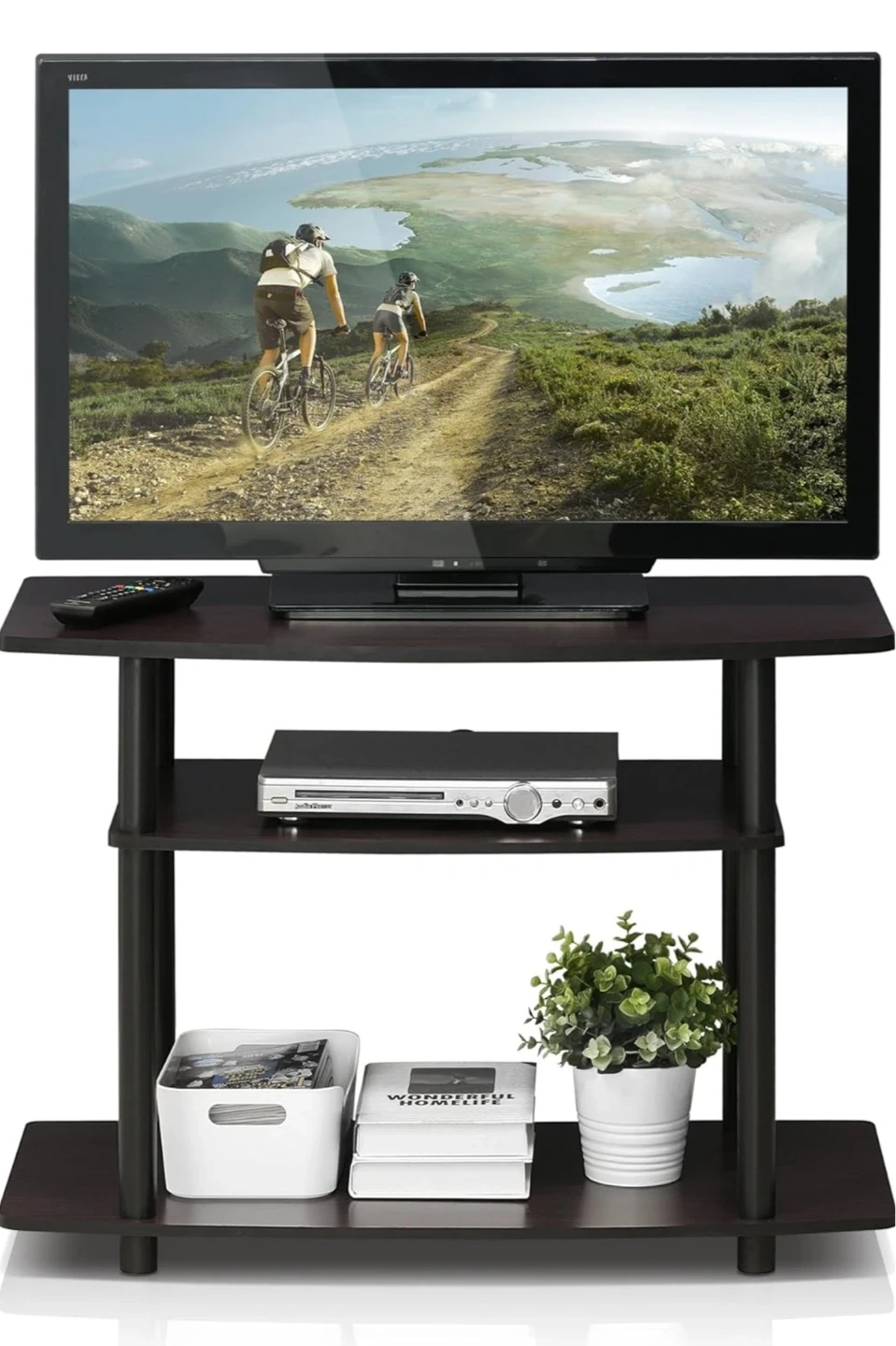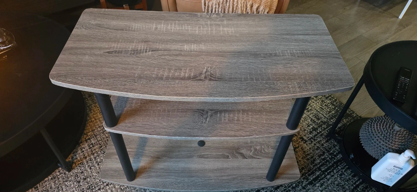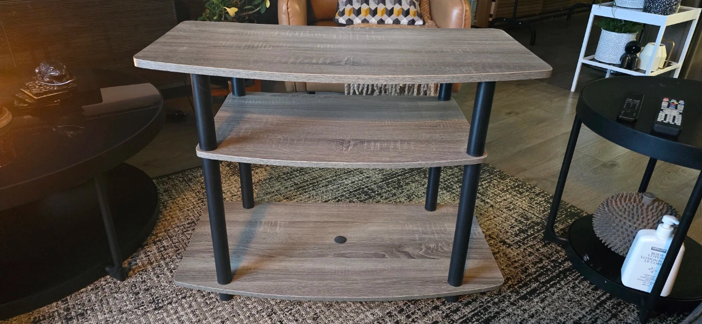 This is a Furinno 3-tier TV stand with a gray oak finish. It's designed with no tools required for assembly. The stand measures 31.5 inches wide and has a weight capacity of 100lbs. It's a great addition for organizing your media devices.