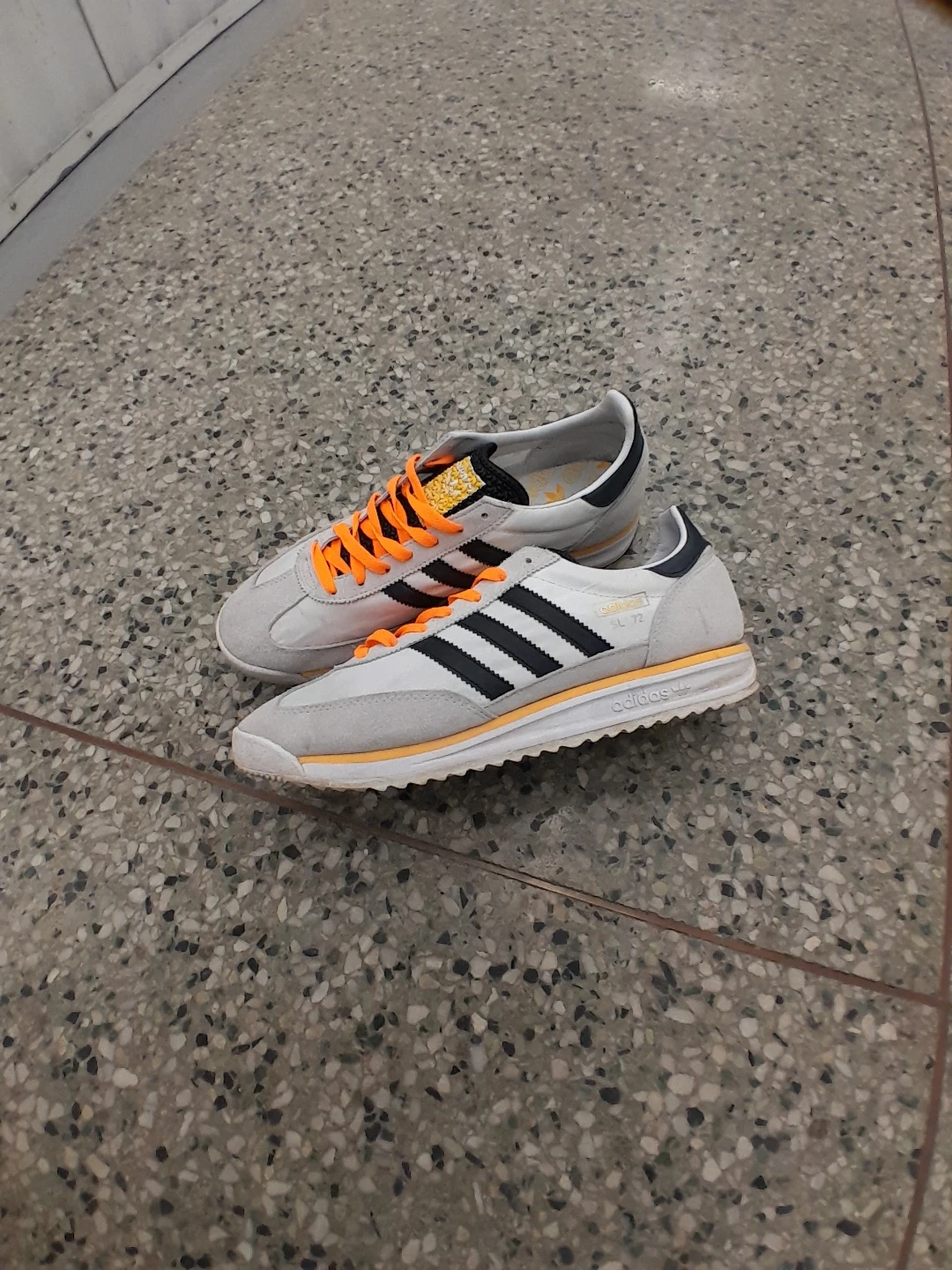 Adidas SL 72 athletic shoes in a grey, black, and orange colourway. They feature classic three-stripe detailing and orange laces. This pair is suitable for casual wear or light athletic activities men's size 11.