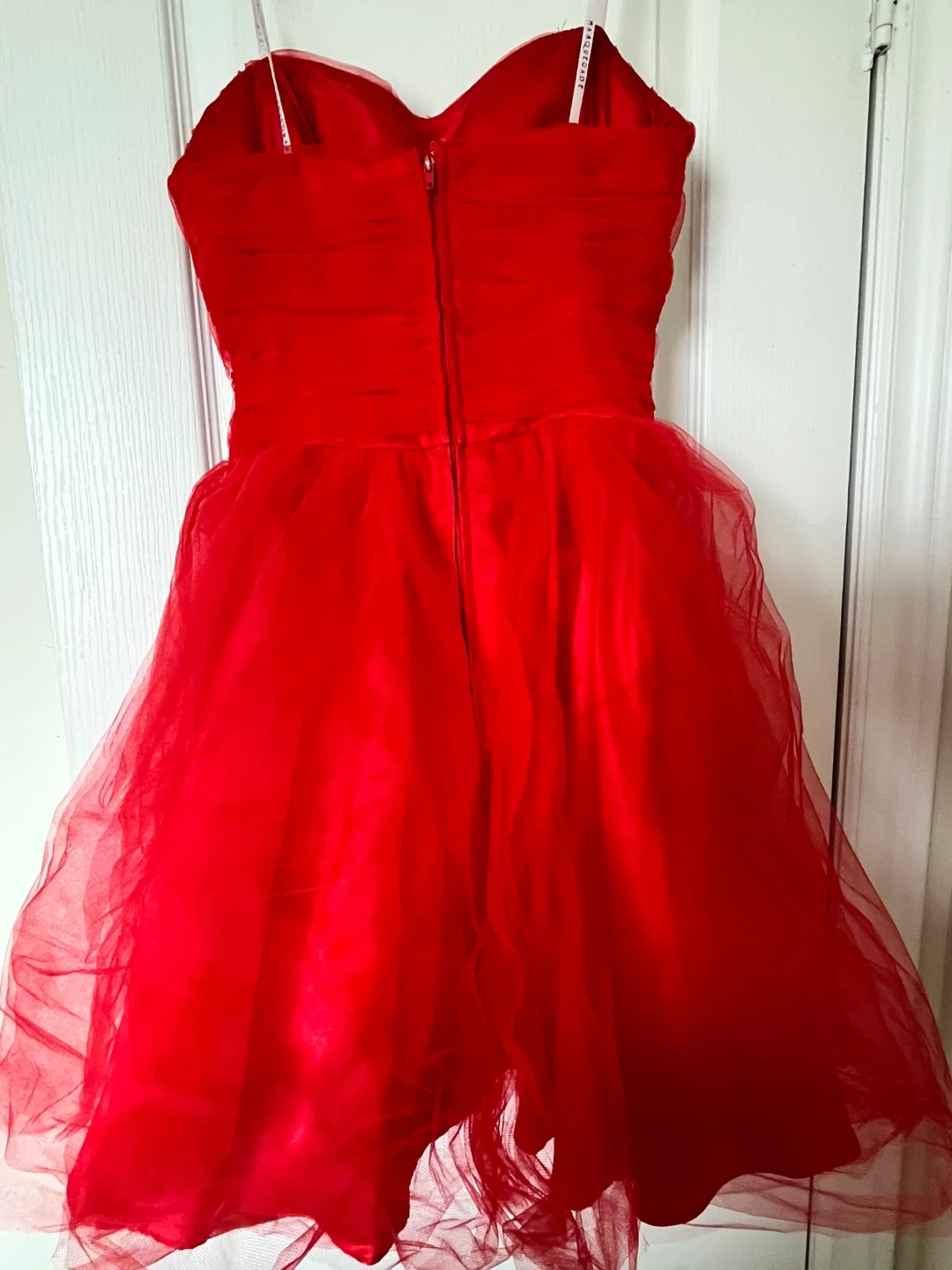 Sweetheart neckline strapless dress. It's a beautiful red colour with a layered tulle skirt. Features a back zipper closure. Size 3/4