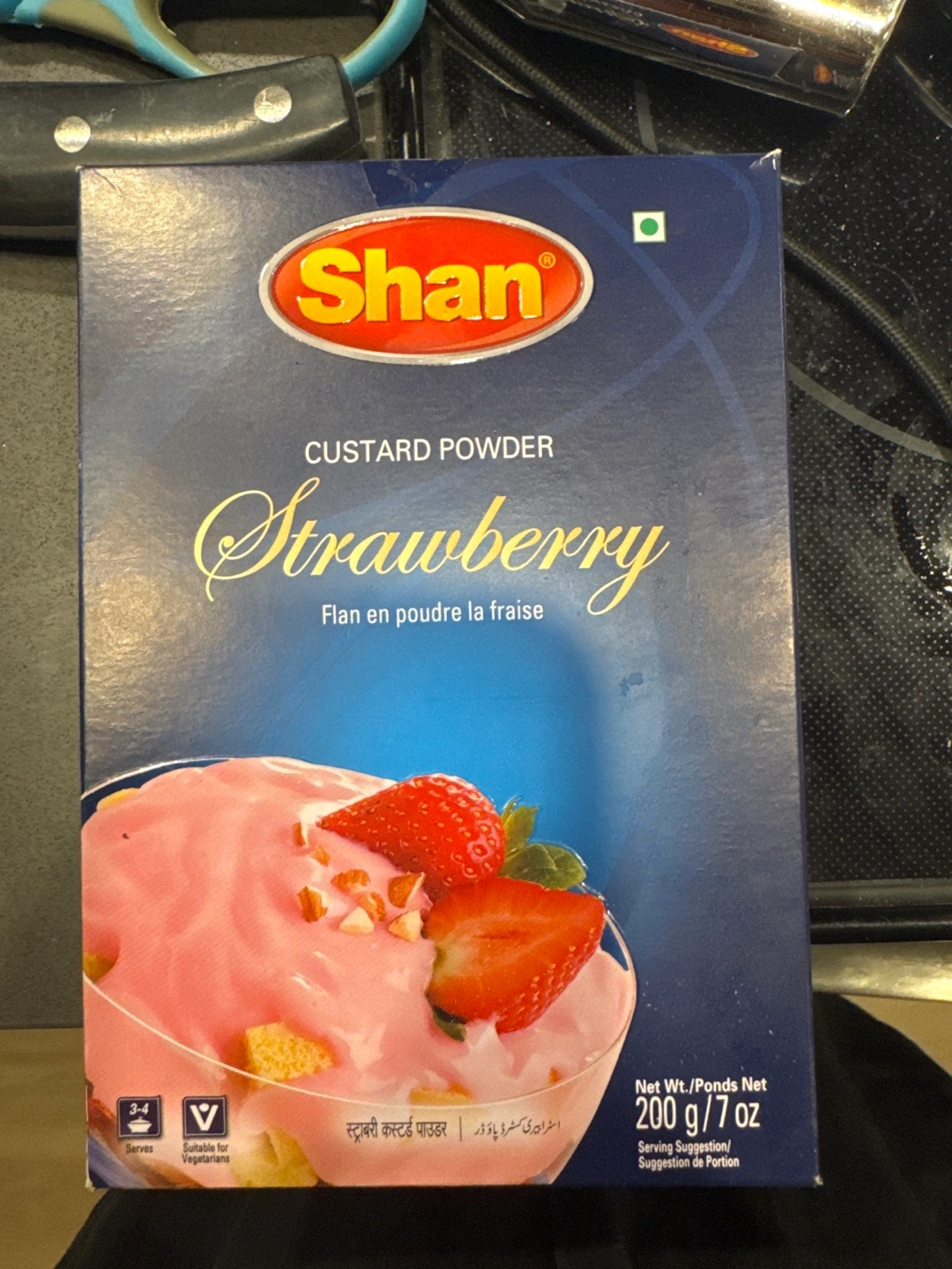 Selling a box of Shan Strawberry Custard Powder. It's 200g / 7 oz and suitable for vegetarians. Perfect for a quick and tasty dessert!