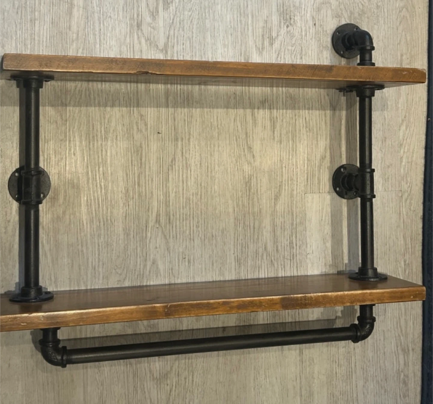 This two-tiered industrial pipe shelf features a rustic wood finish and a black metal pipe frame. It includes a convenient towel bar below the bottom shelf, perfect for bathrooms or kitchens. The design is sturdy and functional.
