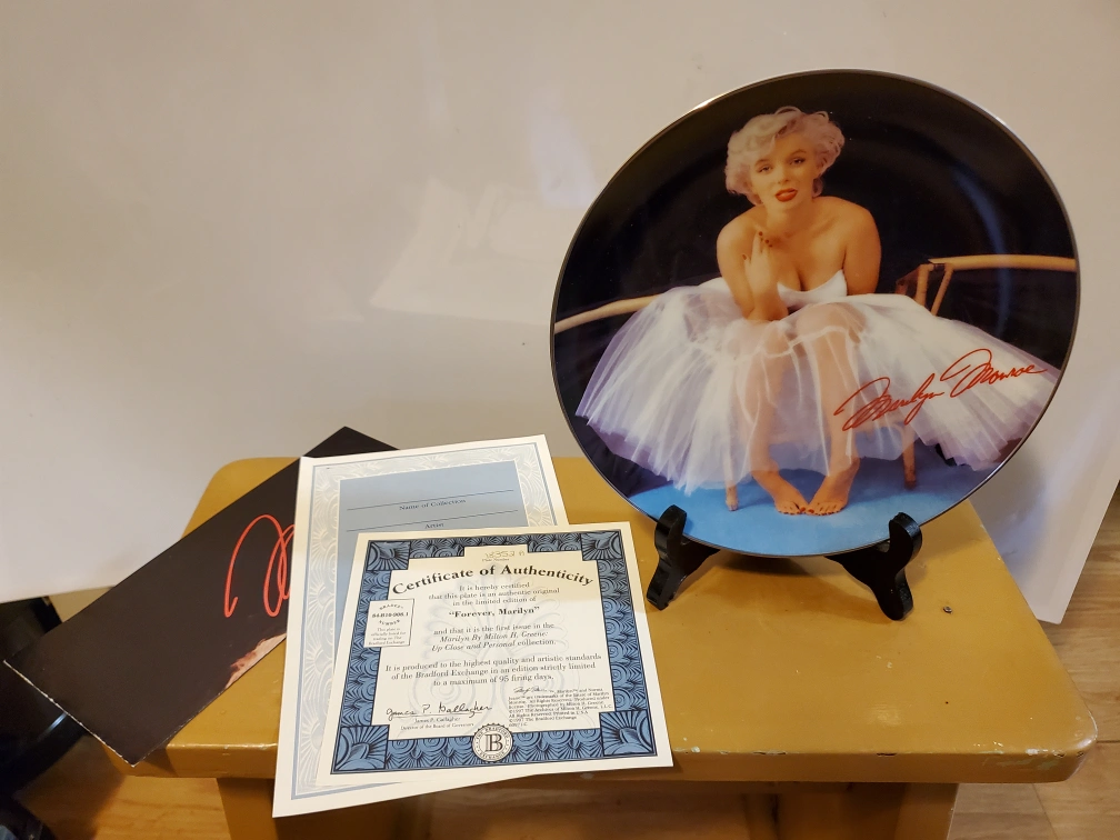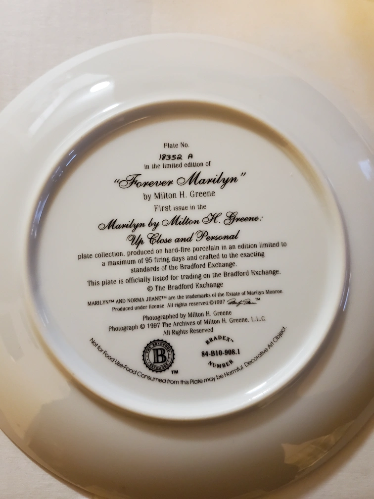 1997 Collectible "Forever Marilyn" plate by Milton H Greene. This is the first issue in the Marilyn by Milton H. Greene: Up Close and Personal plate collection. It's produced on hard-fire porcelain and crafted to the standards of the Bradford Exchange. Comes with a Certificate of Authenticity