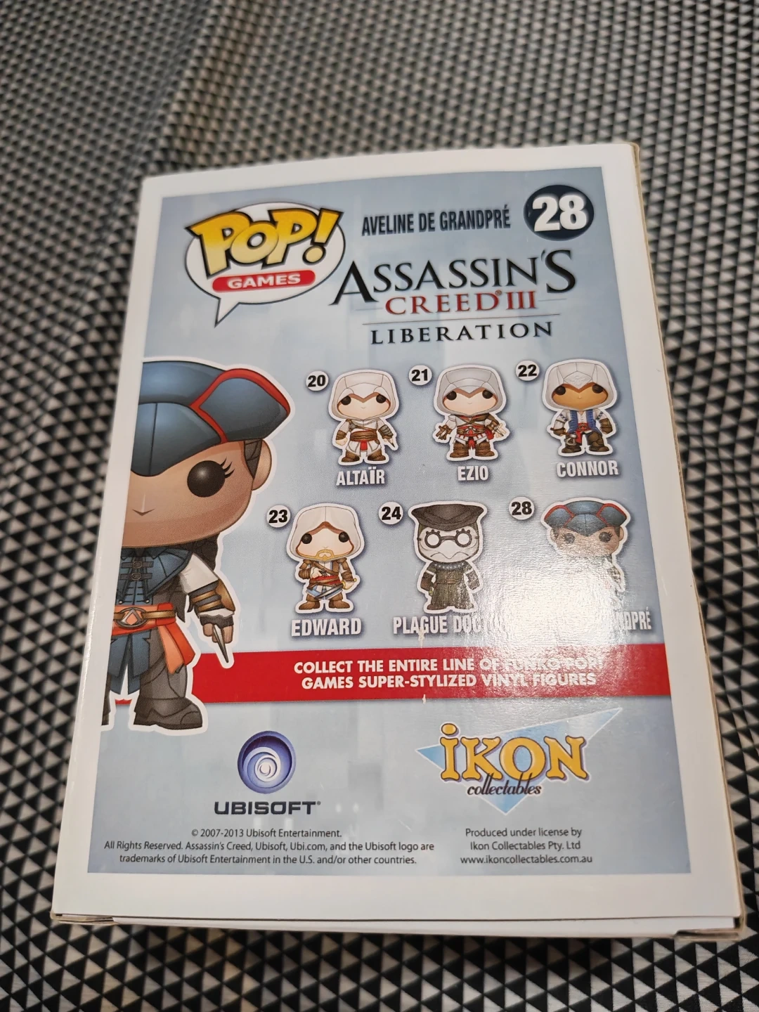 This is a Funko Pop! vinyl figure of Aveline de Grandpré, number 28 from the Assassin's Creed III Liberation series. The figure is in its original packaging. It's designed for collectors aged 15 and up.