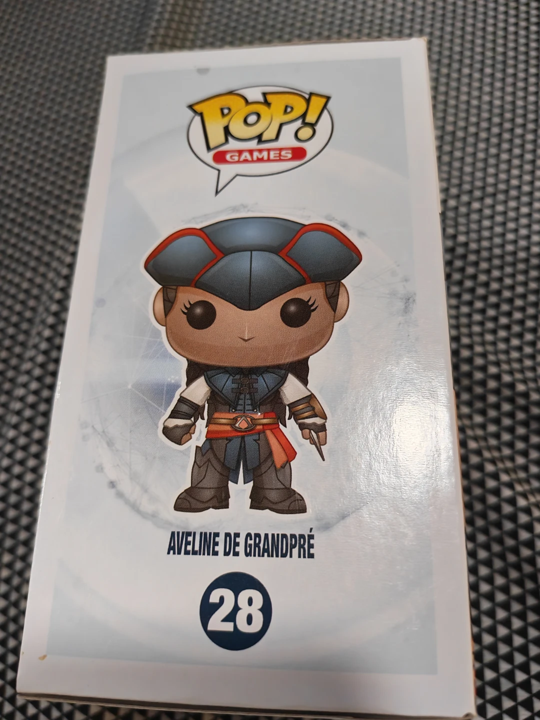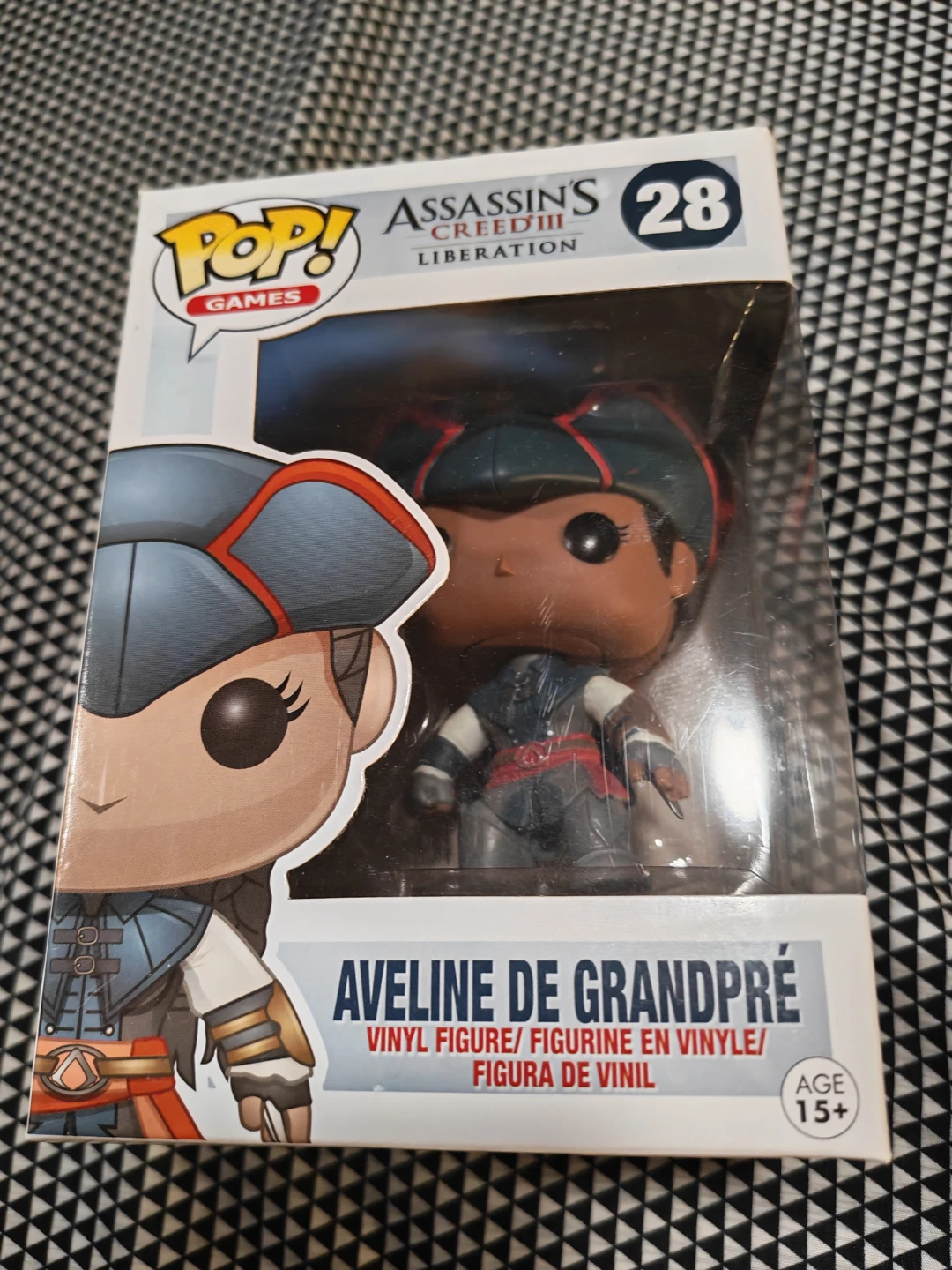 This is a Funko Pop! vinyl figure of Aveline de Grandpré, number 28 from the Assassin's Creed III Liberation series. The figure is in its original packaging. It's designed for collectors aged 15 and up.