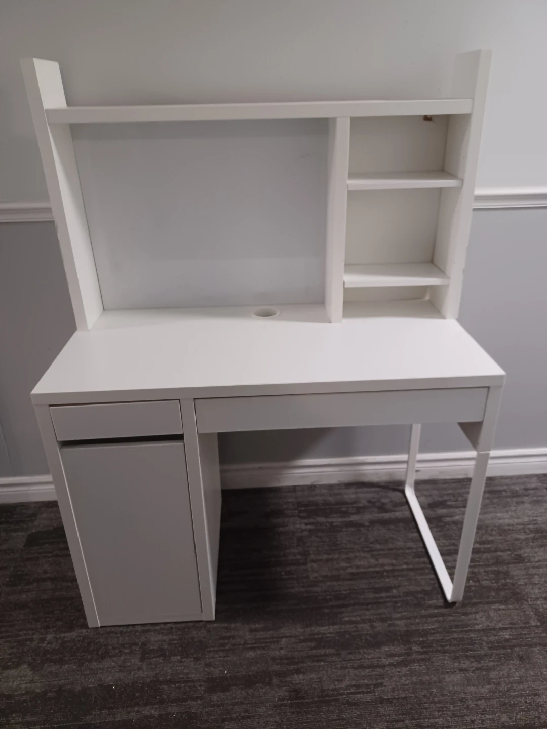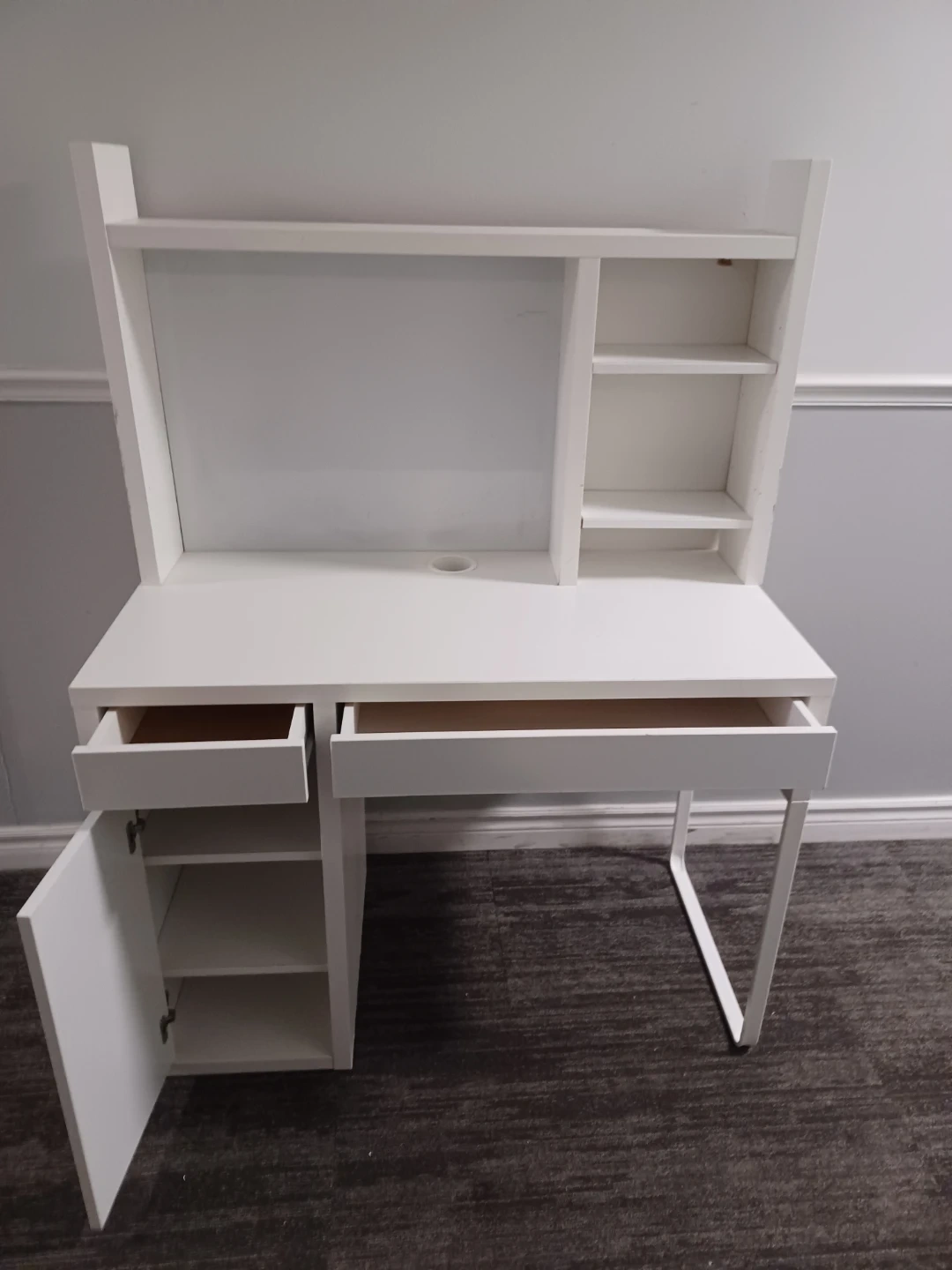 White computer desk with a hutch for storage. It includes one drawer and a cabinet with shelving. The desk also features an open shelf above the main surface and additional shelving on the right side of the hutch. There's a cable management hole on the desk surface. This desk is suitable for a home office or student setup.