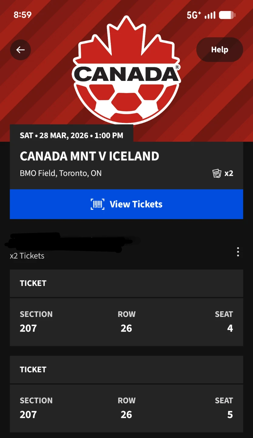Two tickets to the Canada Men's National Team vs Iceland match on March 28, 2026, at BMO Field in Toronto. Seats are Section 207, Row 26, Seats 4 and 5. Game starts at 1:00 PM.