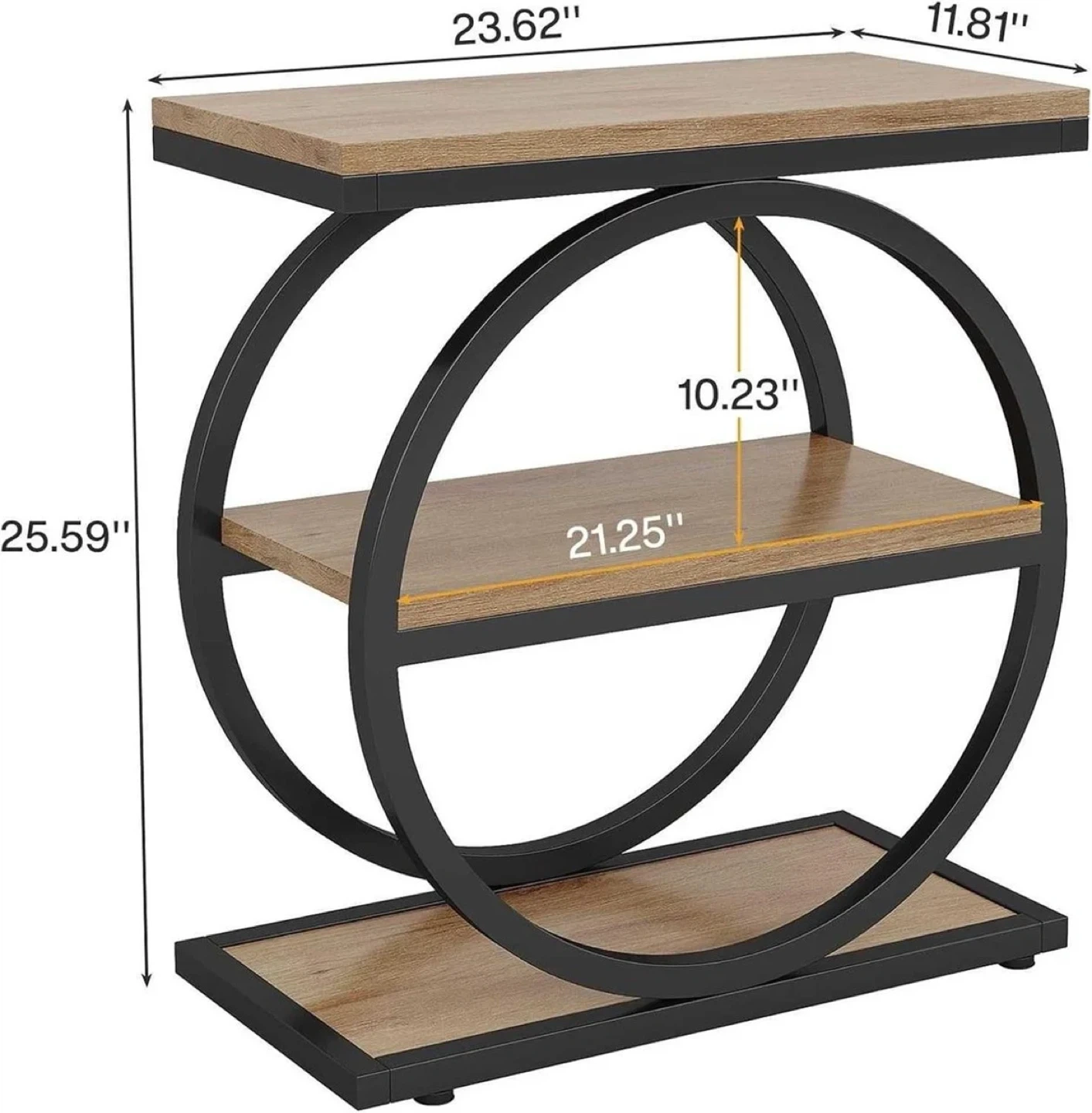 This end table features a rustic wood-grain finish and a black metal frame. It has two shelves for storage and display. The circular side design adds a modern touch. It's great for small spaces or as an accent piece.