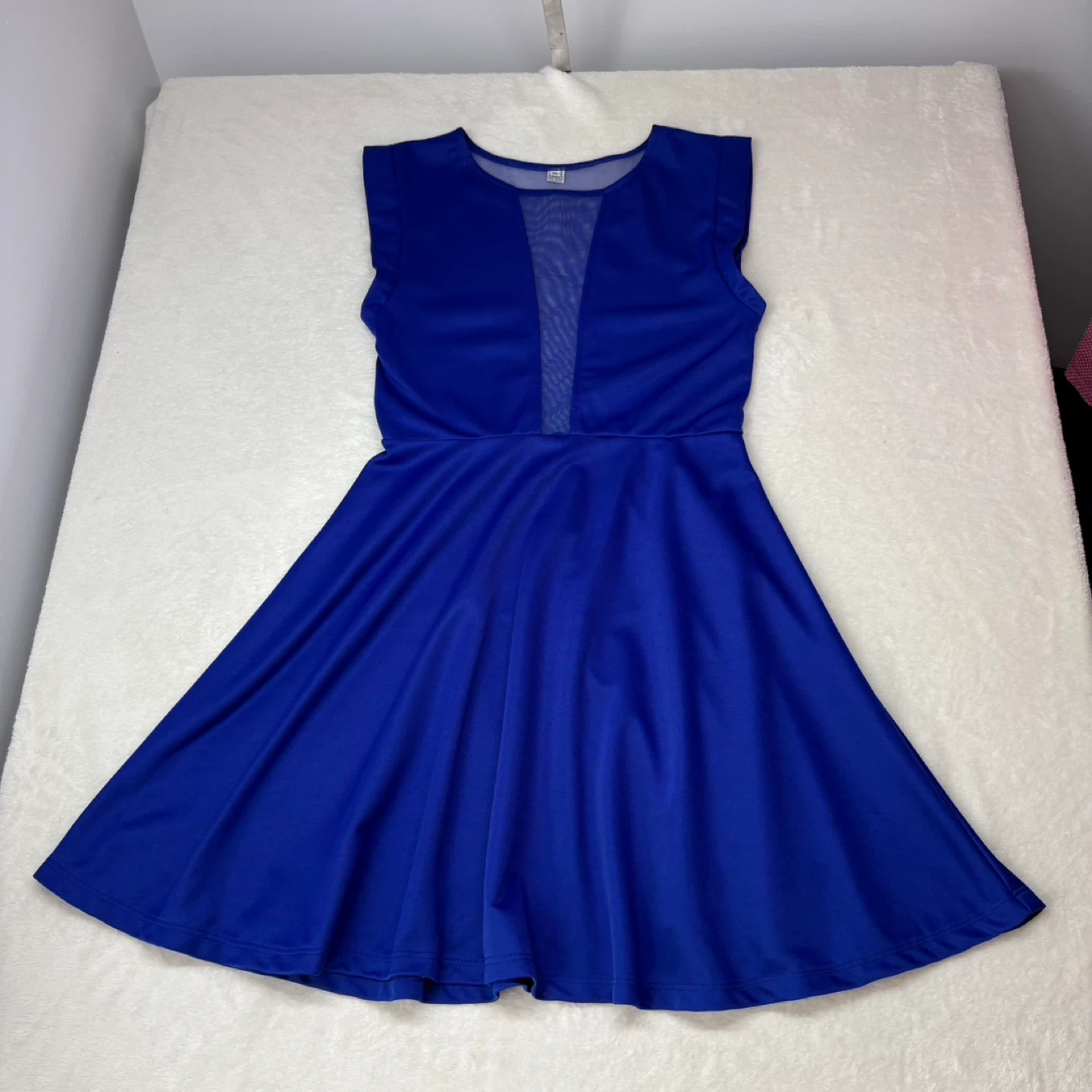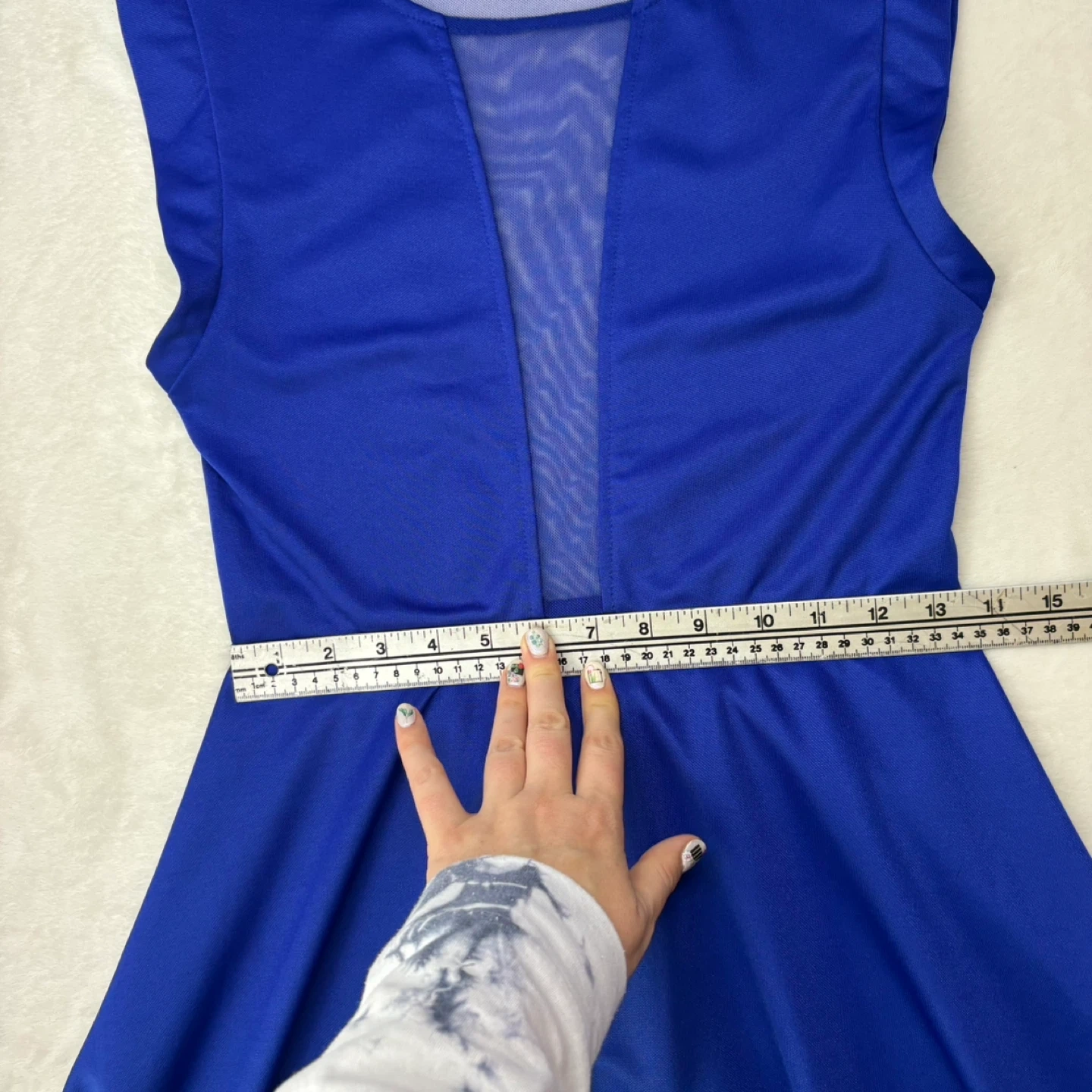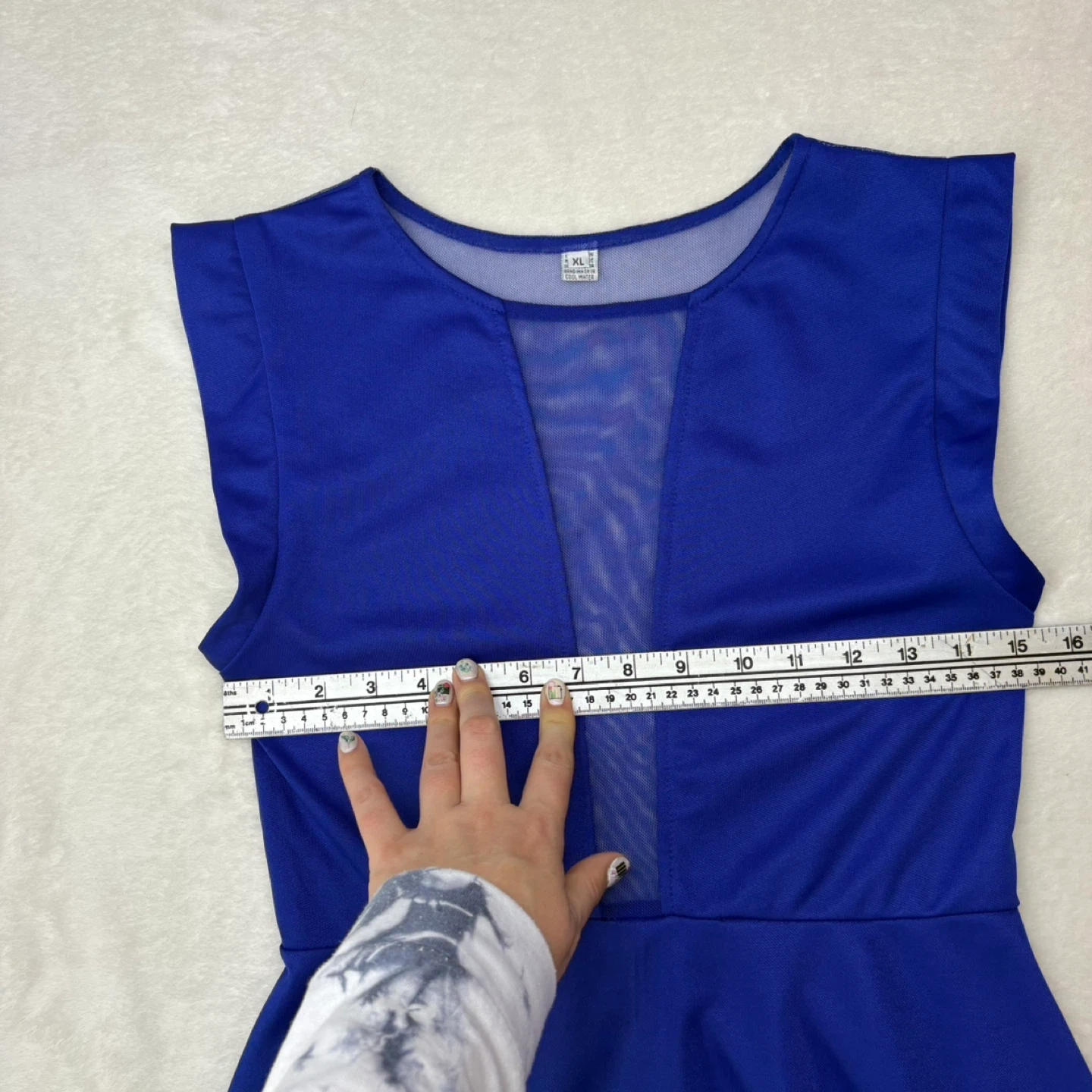 This vibrant royal blue dress features a striking sheer mesh deep V-panel at the front and a fully sheer mesh back. Designed with a sleeveless fit-and-flare silhouette, it offers a bold look for parties or evening events. Despite the XL tag, the measurements indicate a much smaller fit.