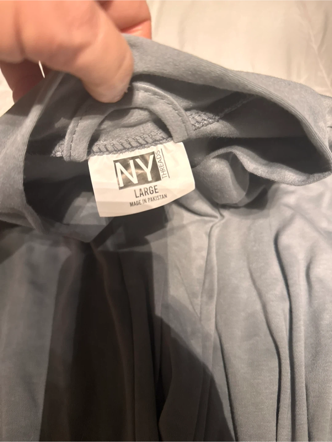 This is a NY Threads robe in grey. It's a size large and made in Pakistan. It features a tie belt.