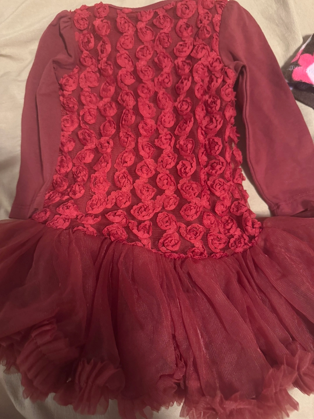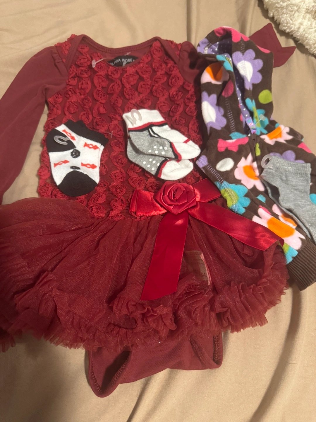 #free cycle#. Adorable baby girl's outfit bundle. Includes a burgundy tutu dress with 3D floral detail, long sleeves, and a big bow. Also features three pairs of baby socks and a colourful hooded jacket. Great for special occasions or everyday wear.