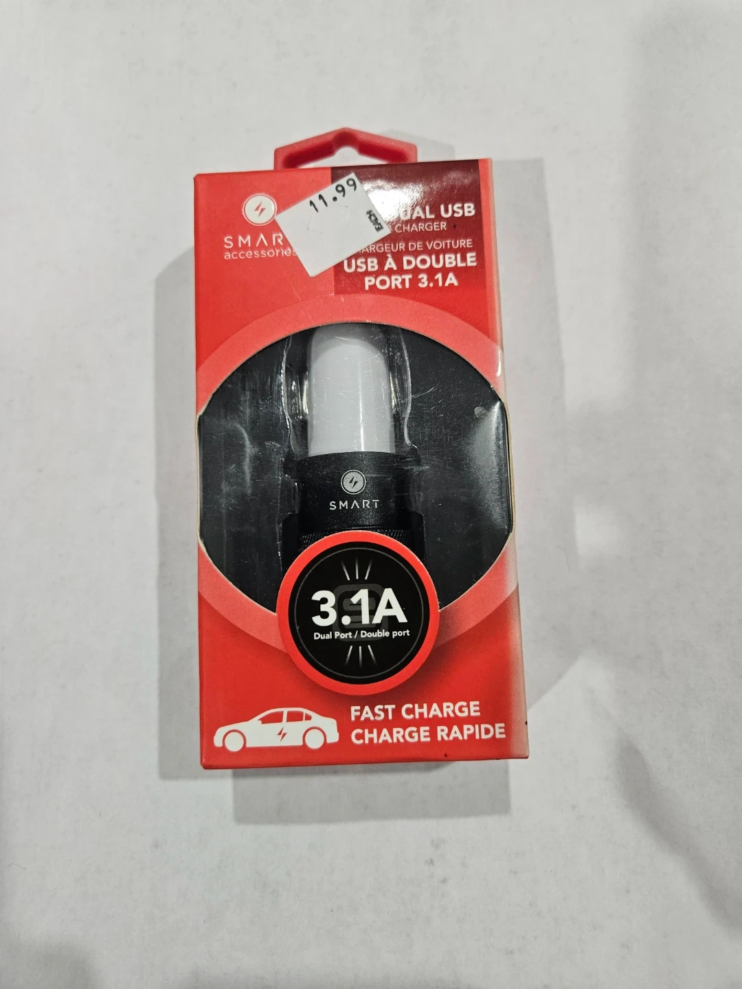 This is a SMART Accessories 3.1A dual USB car charger. It offers fast charging and includes a built-in LED indicator. Case material is PC/ABS high polish & aluminum alloy.