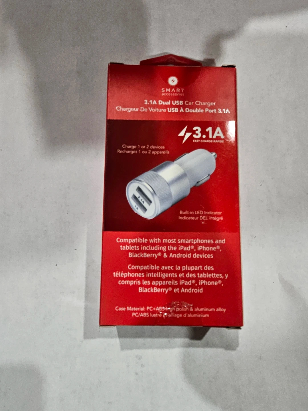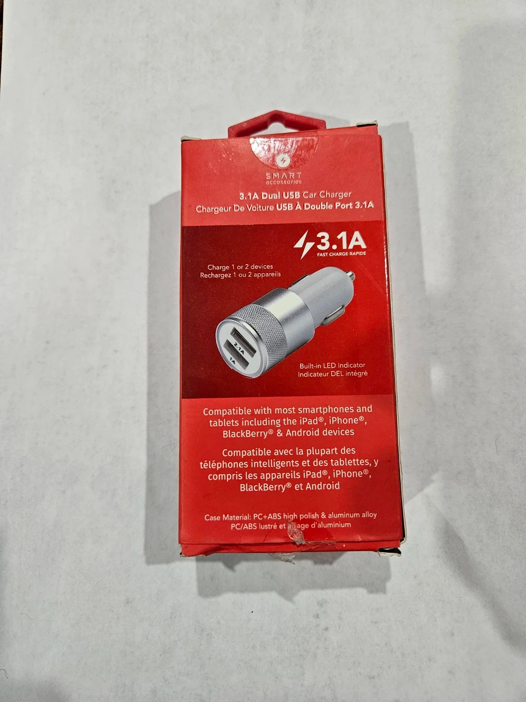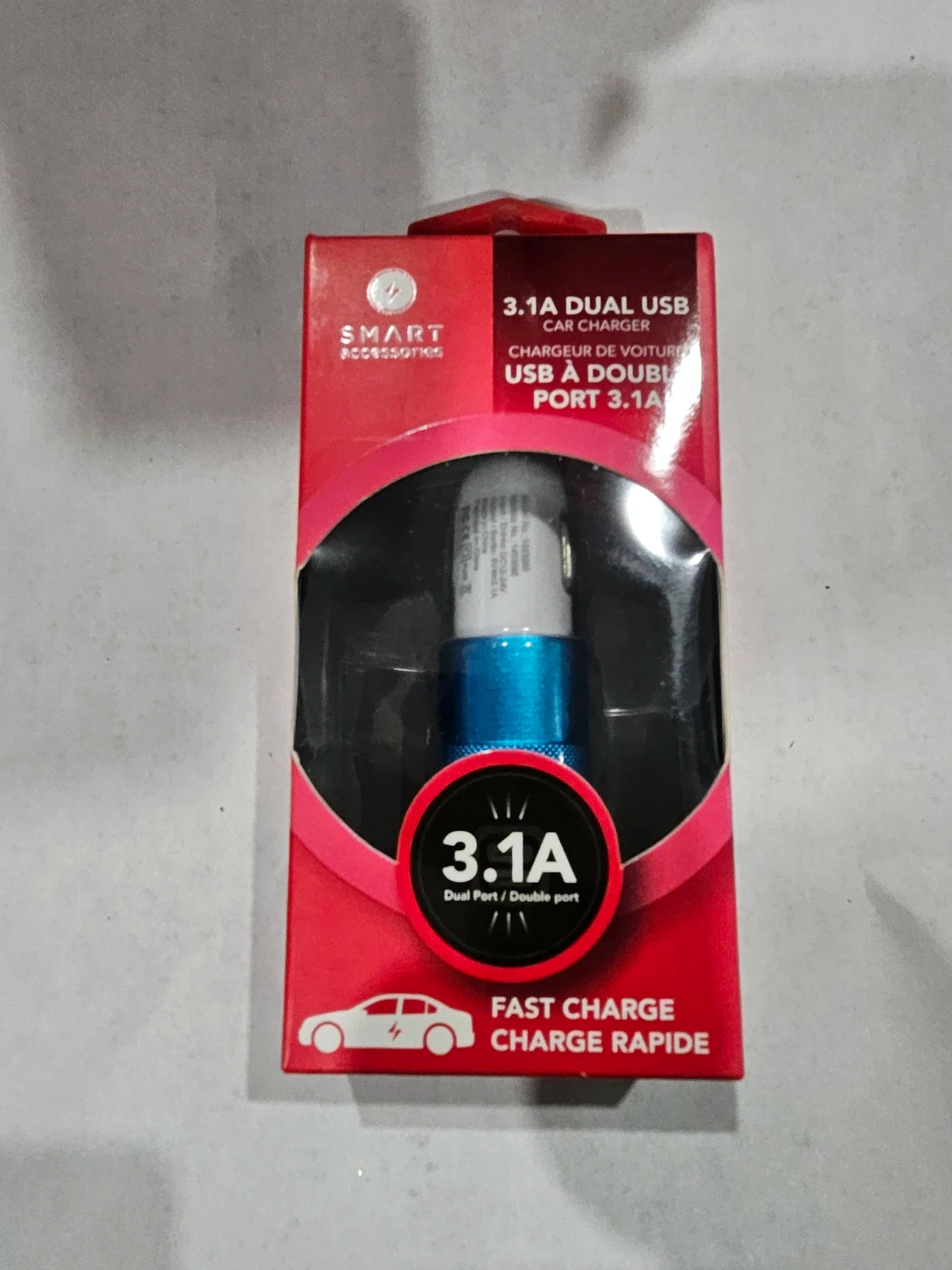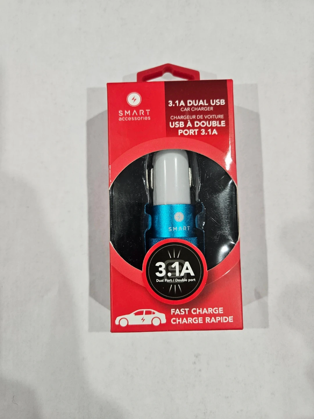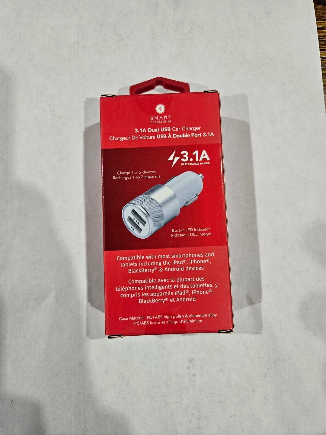 This is a SMART Accessories 3.1A dual USB car charger. It offers fast charging and includes a built-in LED indicator. Case material is PC/ABS high polish & aluminum alloy.