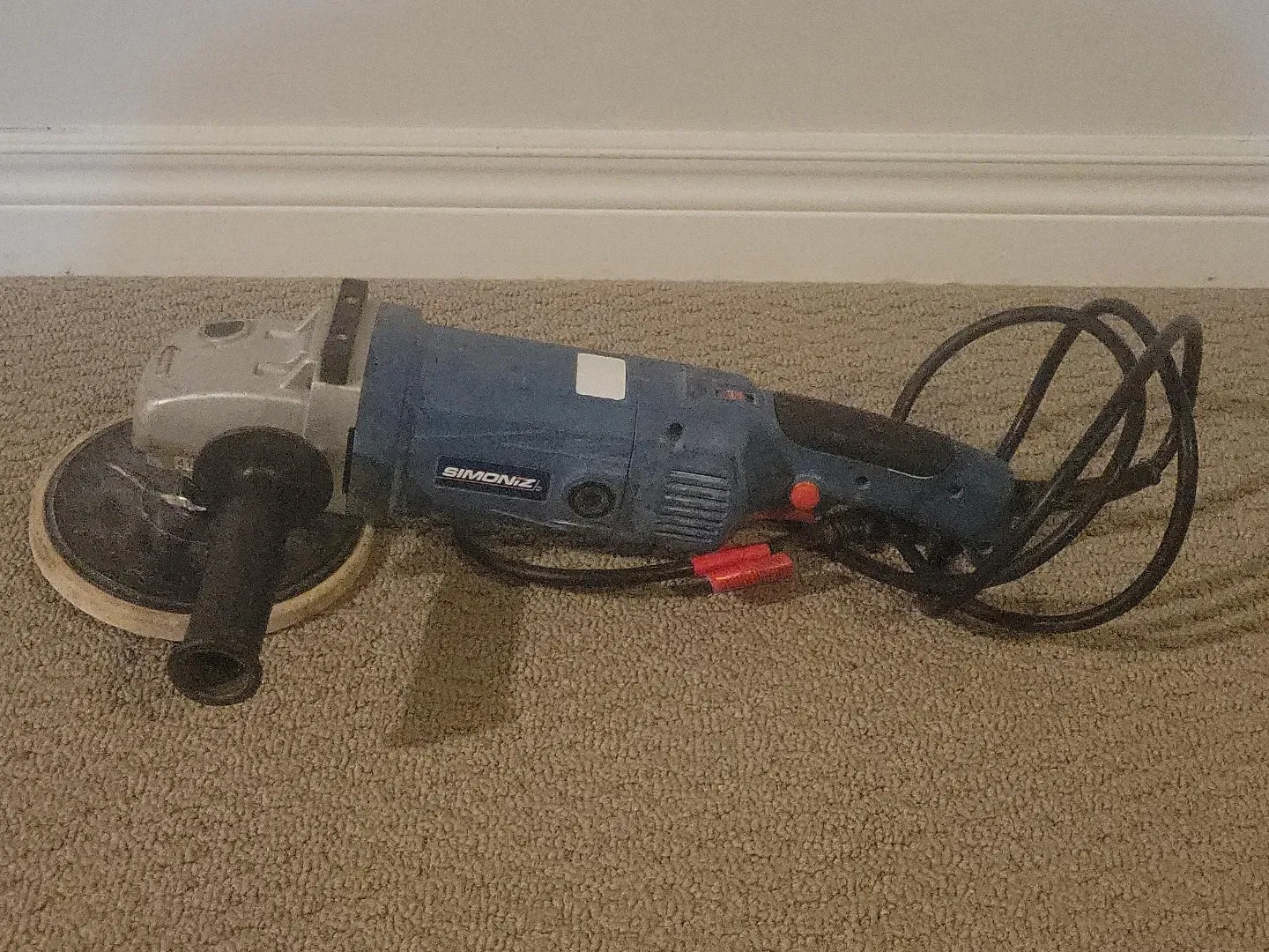 Simoniz orbital buffer polisher with a rotating pad. It has a blue and silver body with a black handle and cord. This tool is suitable for polishing and buffing surfaces.
