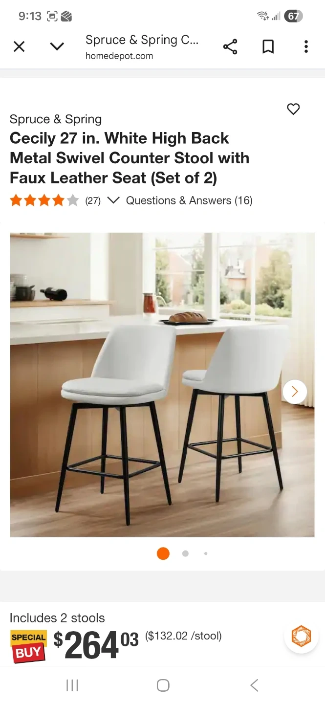 This is a set of two Spruce & Spring Cecily counter stools. They have a 27-inch seat height, high backs, and swivel functionality. The seats are upholstered in white with black metal legs.