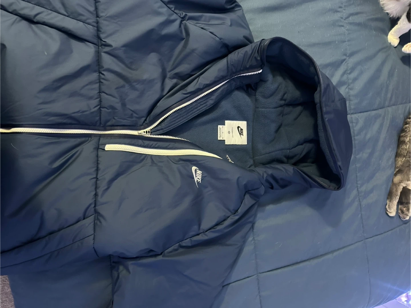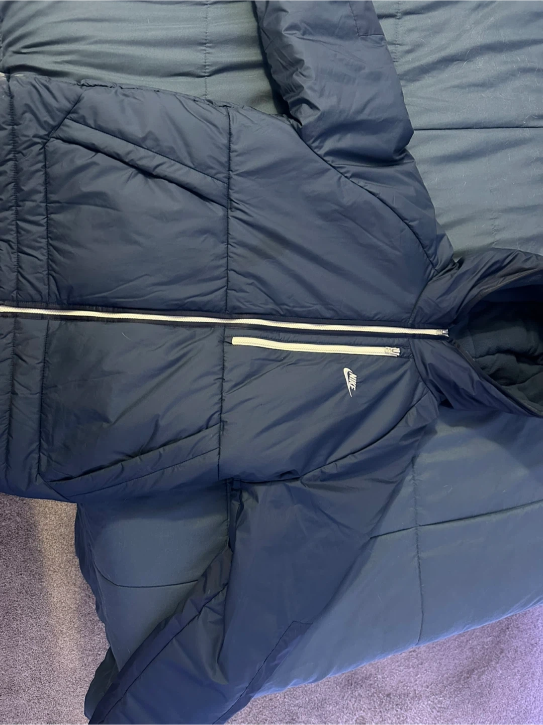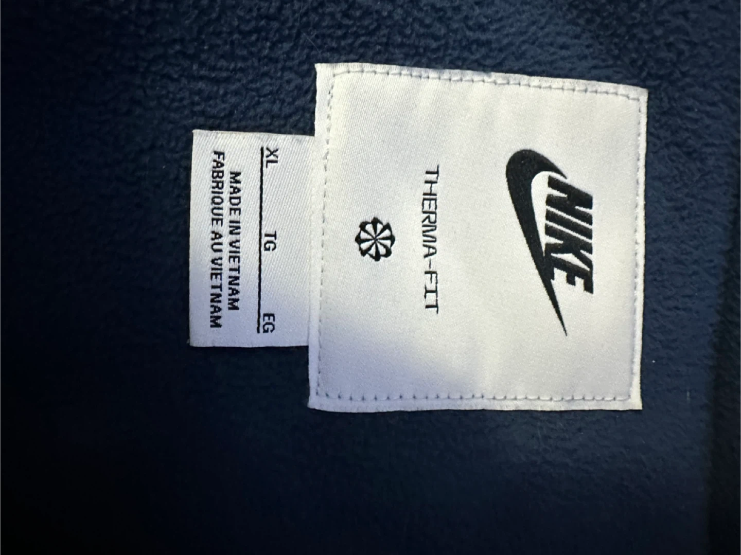 This is a Nike Therma-FIT puffer jacket. It's size XL and made in Vietnam. The jacket is a dark navy colour.