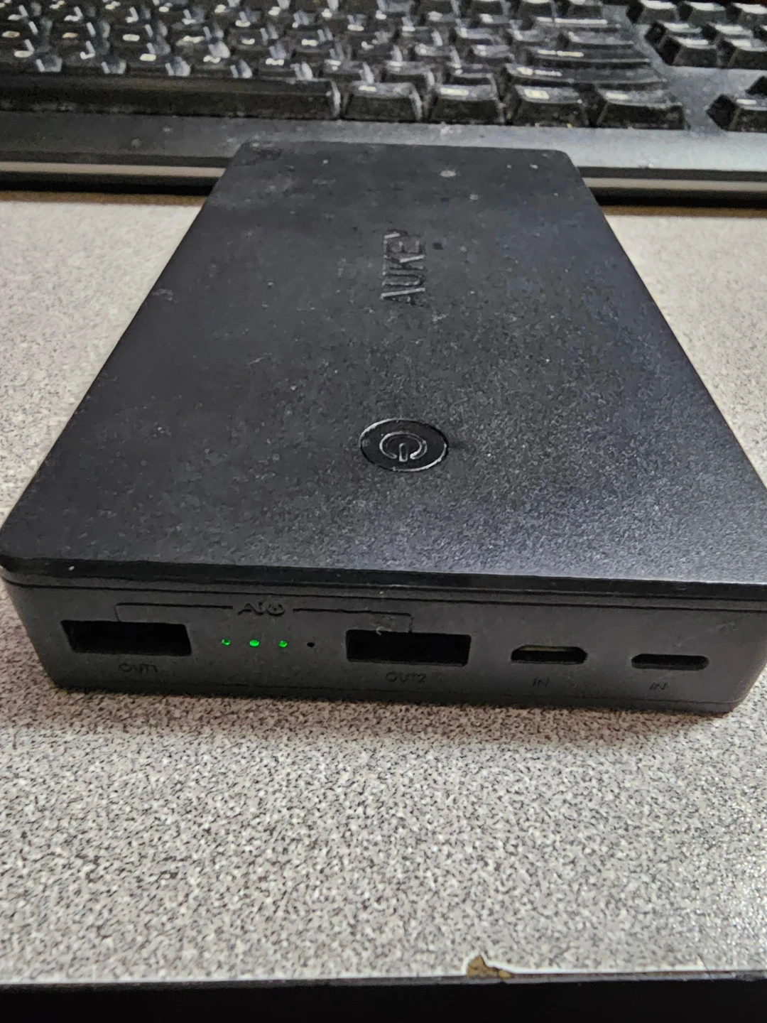 This is an Aukey 20000mAh power bank. It has a capacity of 74Wh and multiple output ports. Lightning input, DC 5V = 2A. Micro input, DC 5V = 2A. Output: DC 5V = 3.4A (batch 2.4A Max).