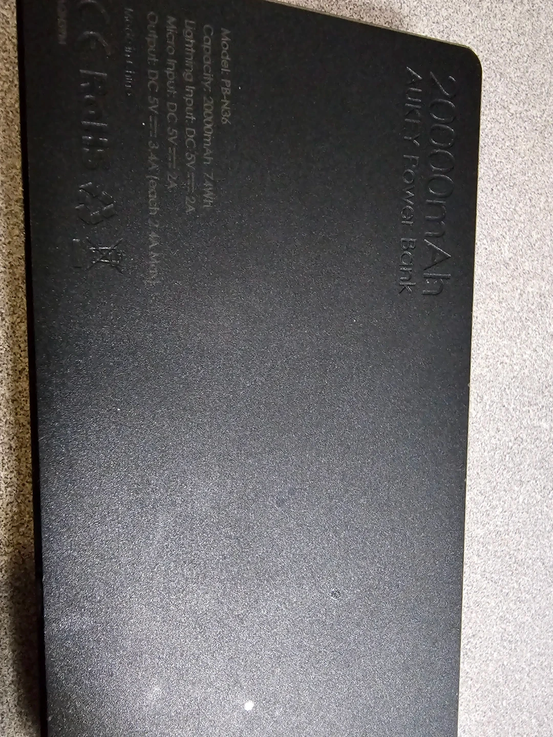 This is an Aukey 20000mAh power bank. It has a capacity of 74Wh and multiple output ports. Lightning input, DC 5V = 2A. Micro input, DC 5V = 2A. Output: DC 5V = 3.4A (batch 2.4A Max).