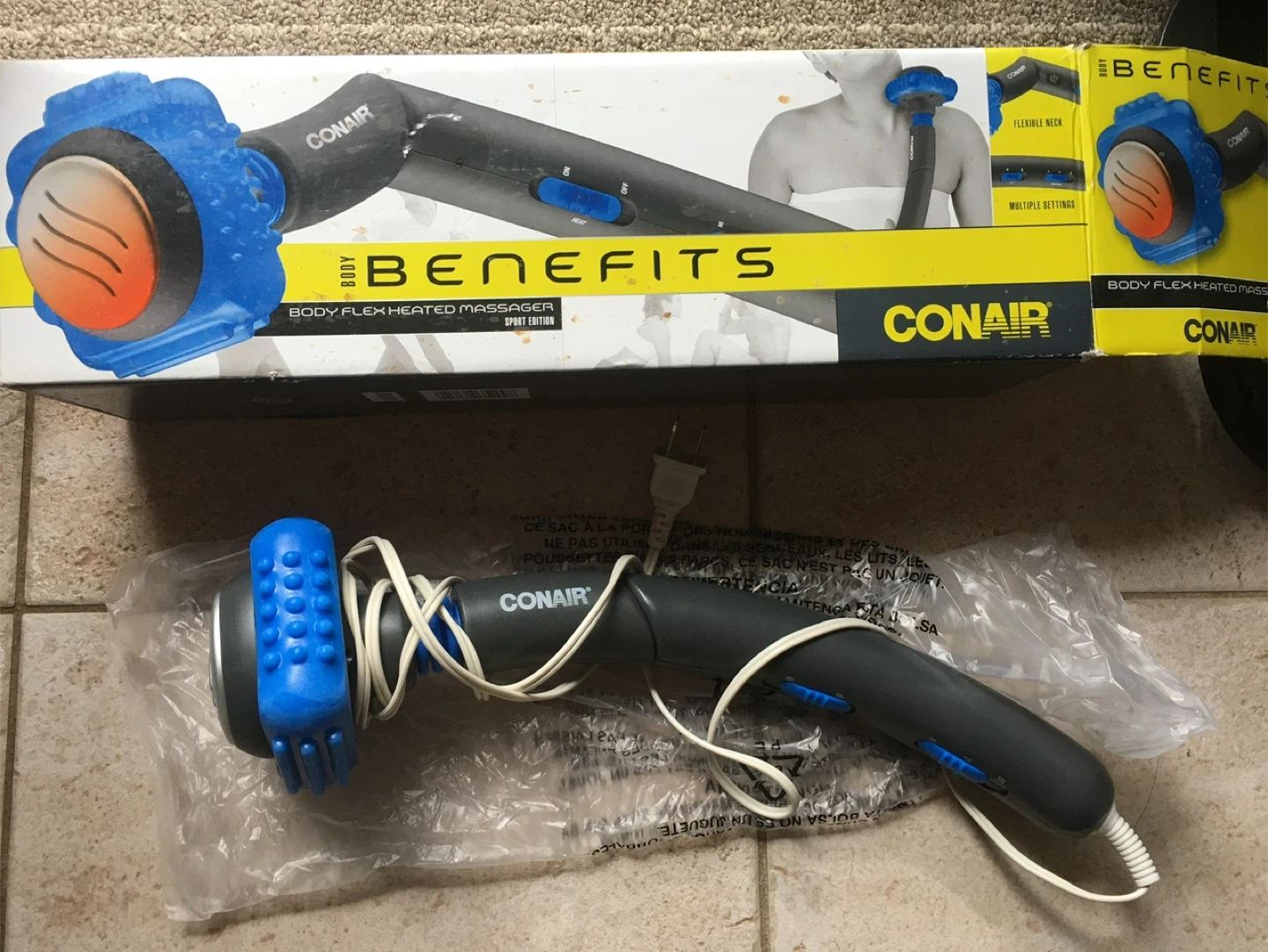 Brand New; NEVER USED!! This Conair Body Benefits massager features a heated tip for relief. It has a flexible neck and 6 different textured massage heads. Multiple settings are available for your comfort.