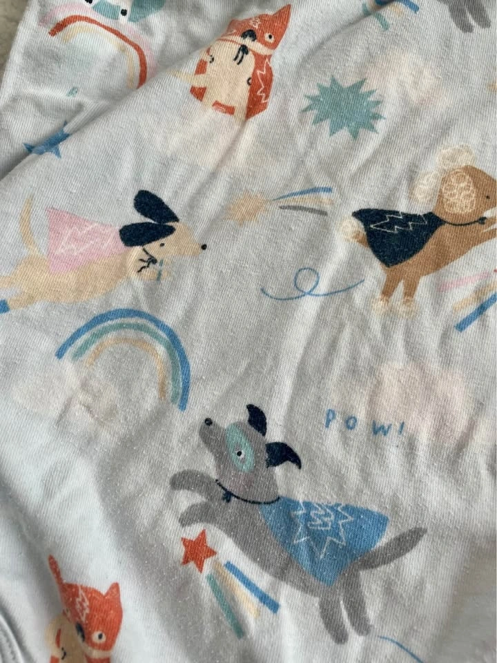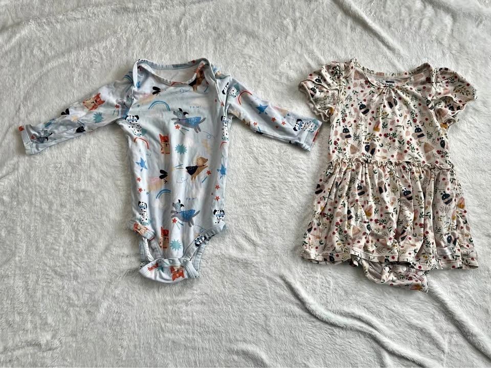 Soft Loulou Lollipop baby outfits, size 12-18 months. This set includes a long-sleeve onesie with a superhero dog print and a short-sleeve dress-style romper with a bee and floral pattern. Made with TENCEL Lyocell, organic cotton, and spandex.
