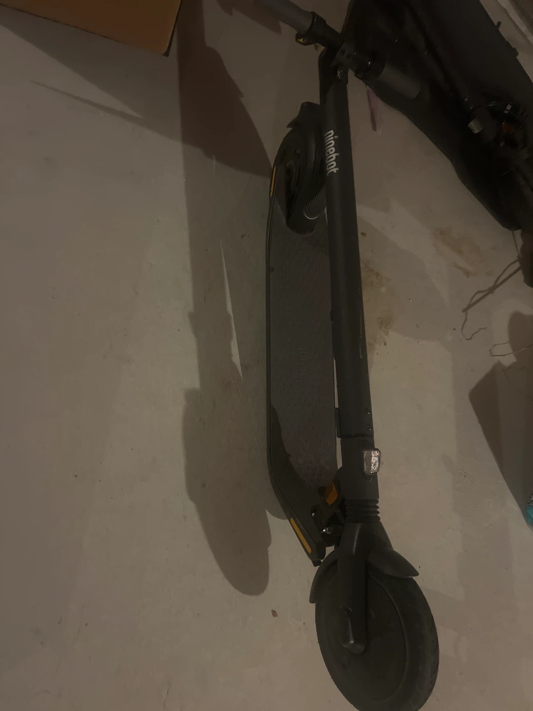 This is a Ninebot electric kickscooter. It's black and foldable for easy storage and transport. It has a built-in light for visibility. This scooter is great for getting around town!