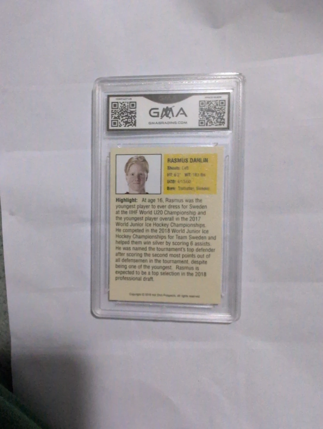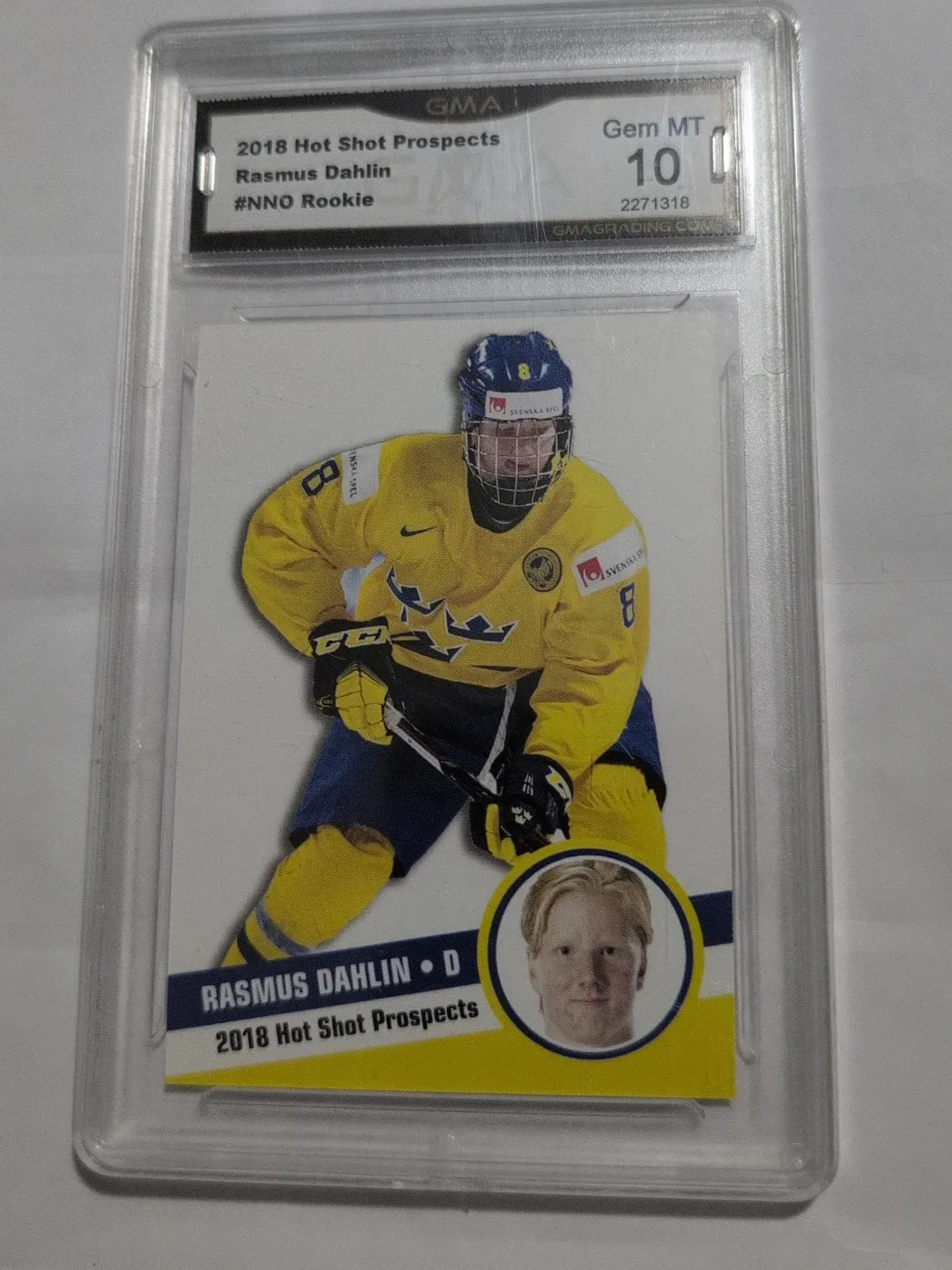 This is a Rasmus Dahlin 2018 Hot Shot Prospects trading card, graded Gem MT 10 by GMA. The card features the Swedish hockey player. The back provides biographical and highlight information about his early career. It's a highly collectible item for hockey fans!