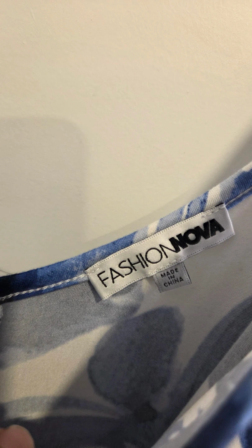 This Fashion Nova maxi dress features a blue and white floral print. It's made from 95% polyester and 5% spandex. The dress has thin spaghetti straps and a V-neckline with pockets. It's an XL size.