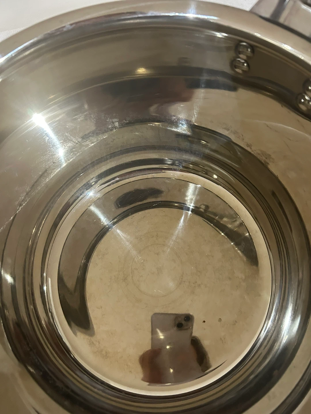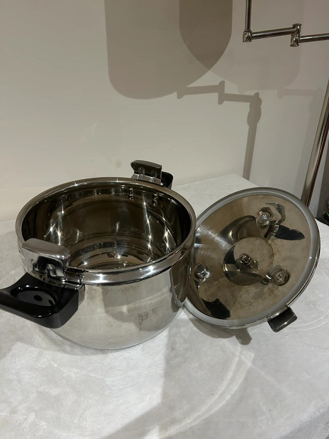 Shiny stainless steel pressure cooker. Includes the lid and handles. Measures 50cm in diameter.