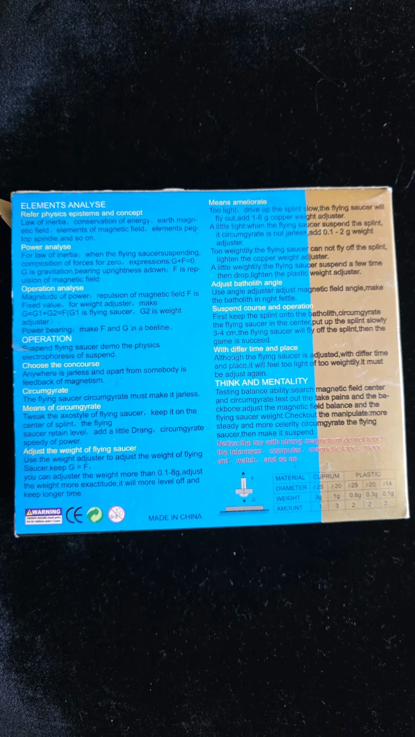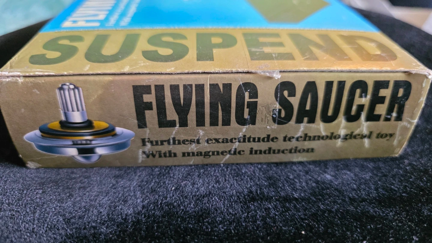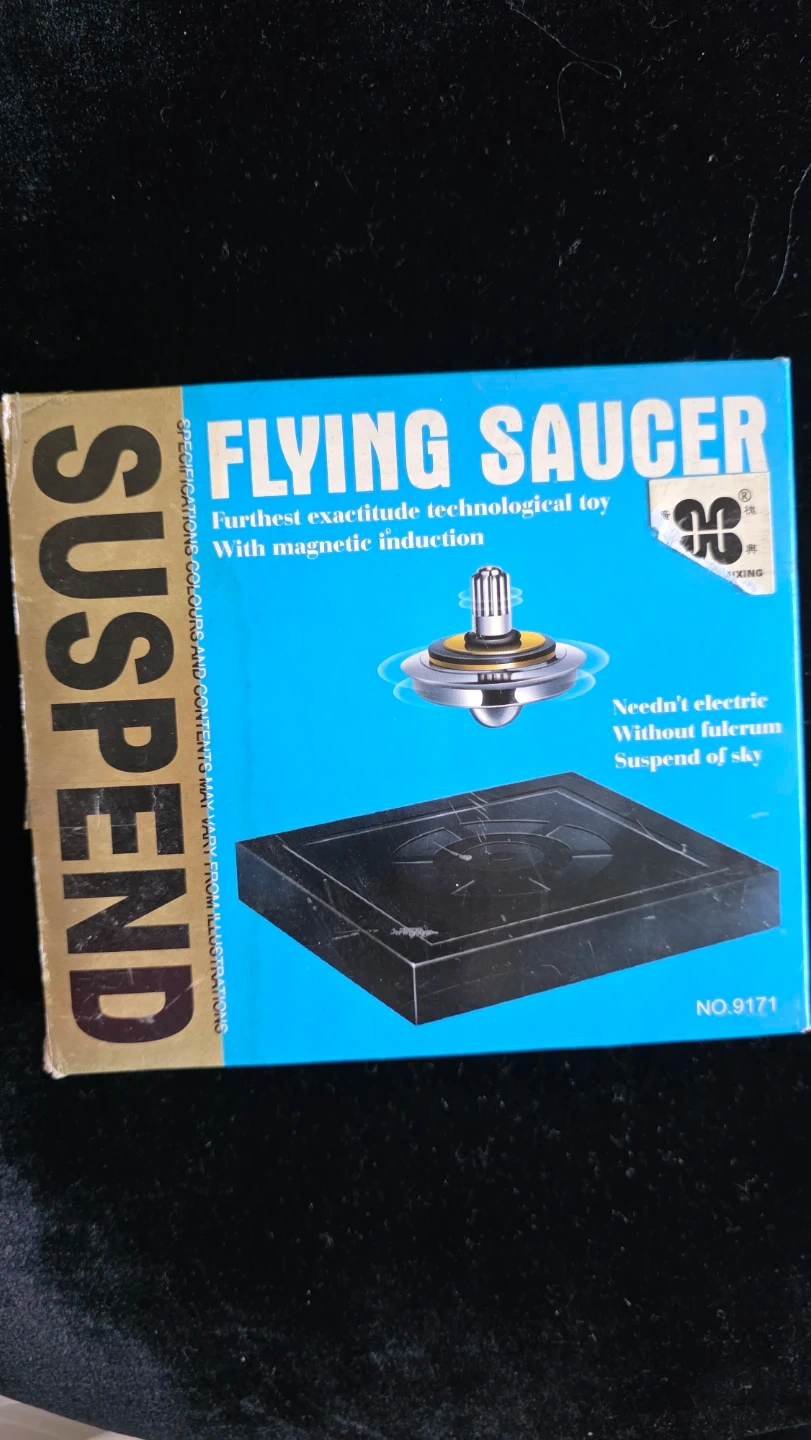 This is a Suspend Flying Saucer, a technological toy with magnetic induction. It doesn't need electricity and can suspend in the air without fulcrum. Includes original box. The toy comes with a magnetic field center and balance. Adjusting the weight can help suspend the flying saucer.