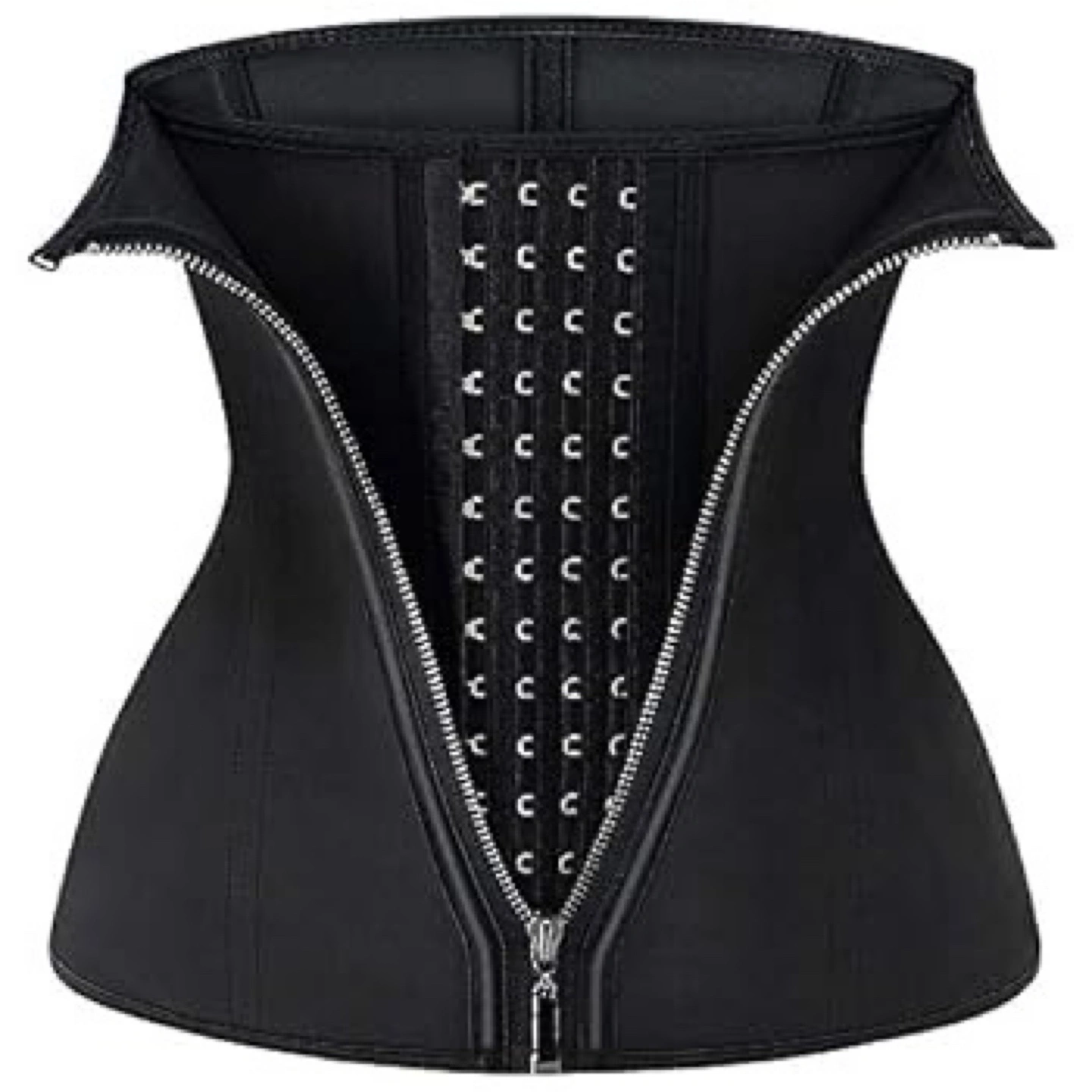 Selling a black waist trainer in size M. It features a zipper and hook-and-eye closures.