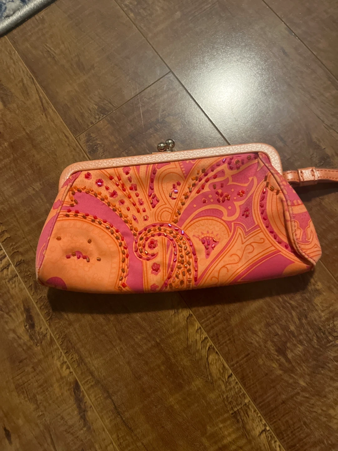 This clutch features a vibrant paisley print with beaded accents. It has a kiss-lock closure and a wrist strap. The interior has a fabric lining.