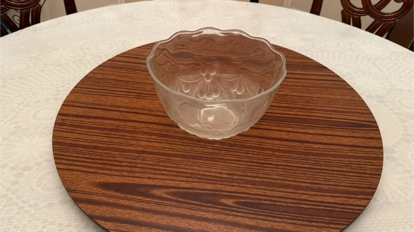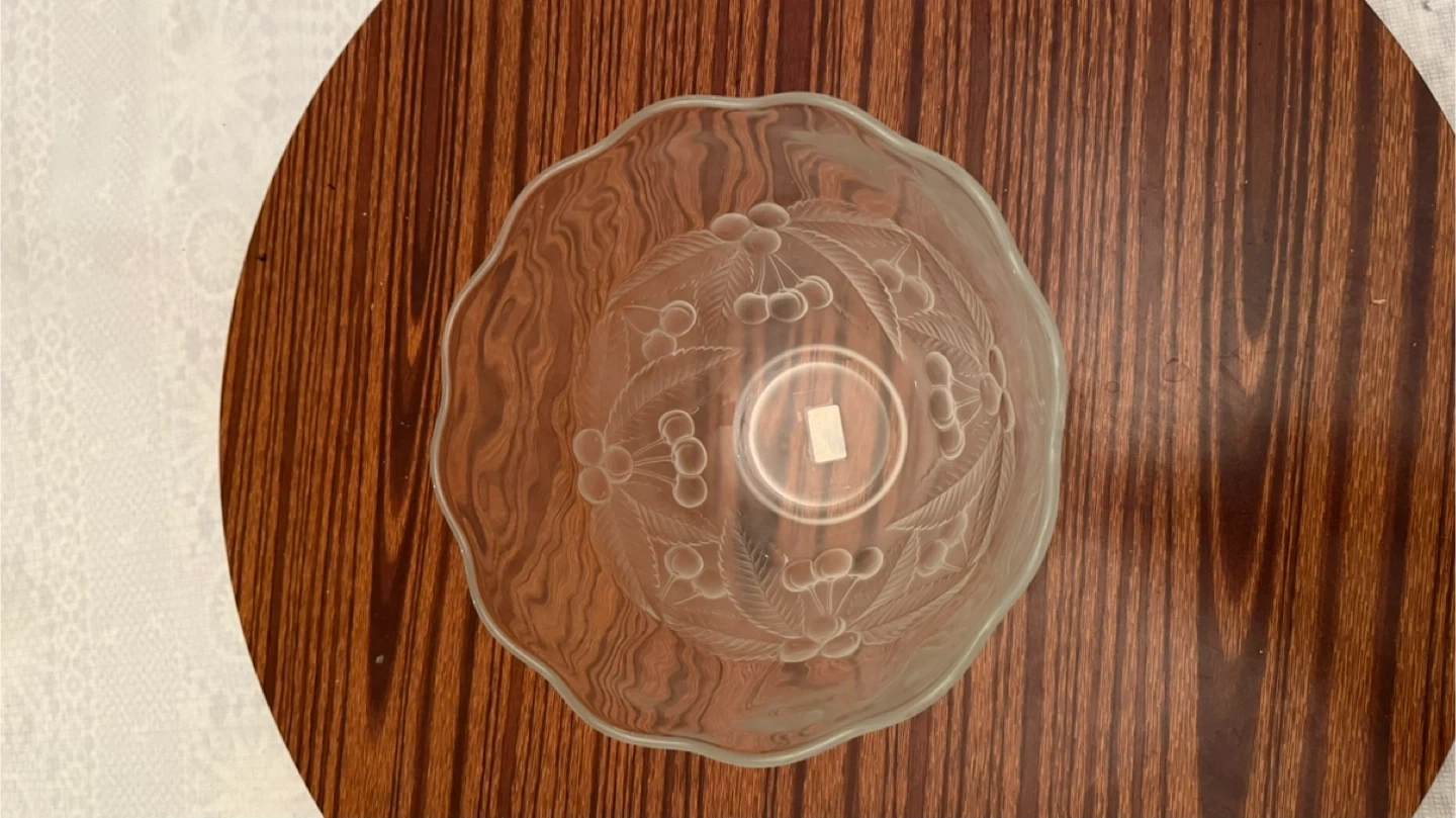 This is a Mikasa Crystal fruit bowl with a cherry motif. It's made of glass and comes with its original box. It's a lovely piece for serving fruit or as a decorative item.