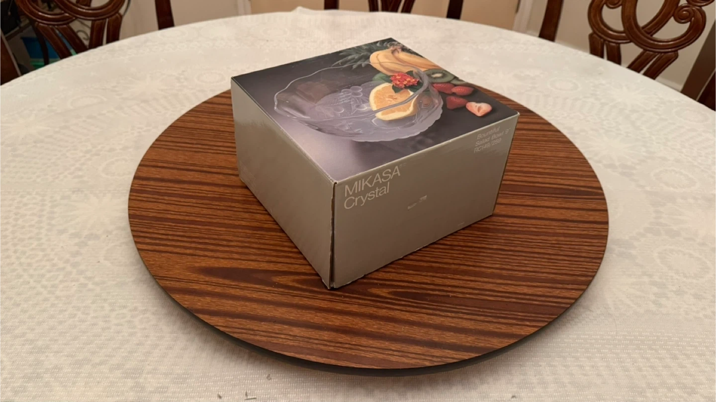 This is a Mikasa Crystal fruit bowl with a cherry motif. It's made of glass and comes with its original box. It's a lovely piece for serving fruit or as a decorative item.
