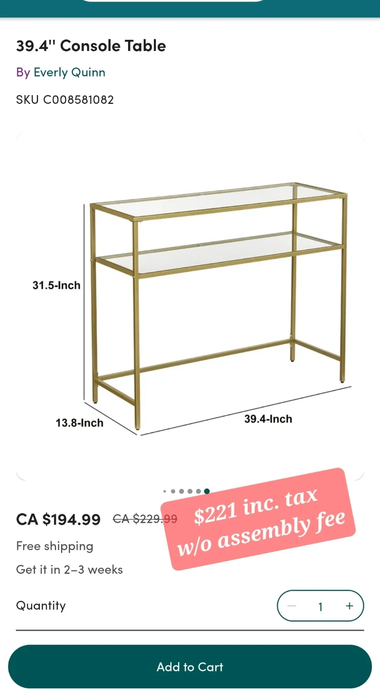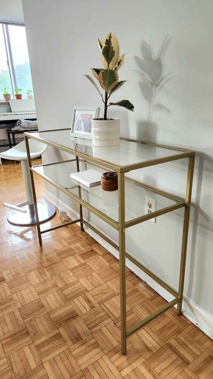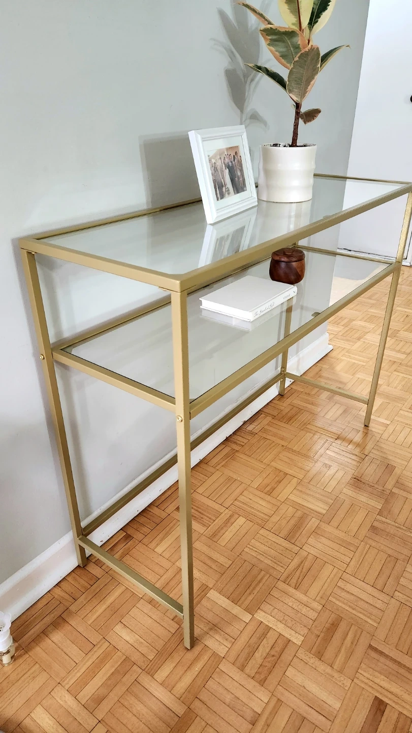 It's brand new and still in box. I have extra, and the pictures are my own. This has never been used and still sealed. Frame is heavy-duty gold color and comes w/ top and middle tempered glasses. Original retail price is $221 including tax (save $$), so price is not negotiable. See pictures and confirm dimensions.